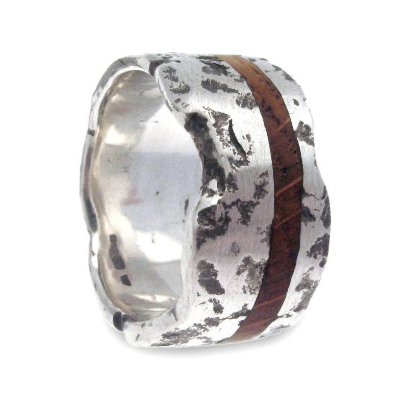 From Justin Duance jewelry, this gorgeous wedding ring is created from a chunky, textured silver and features a beautiful oak wood inlay. It’s the perfect man’s wedding ring and looks rugged and elegant at the same time.