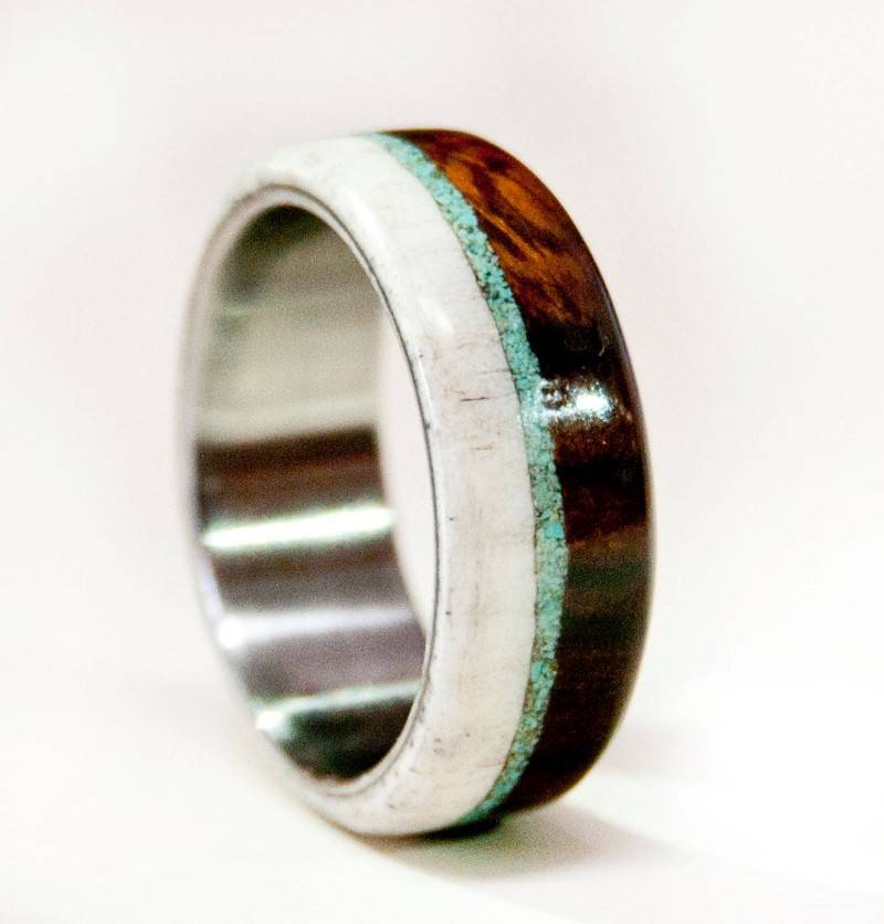This very unique ring, available from Etsy, features wood, antler, titanium and turquoise. The colors contrast with each other to create a beautiful overall look that is elegant and polished.