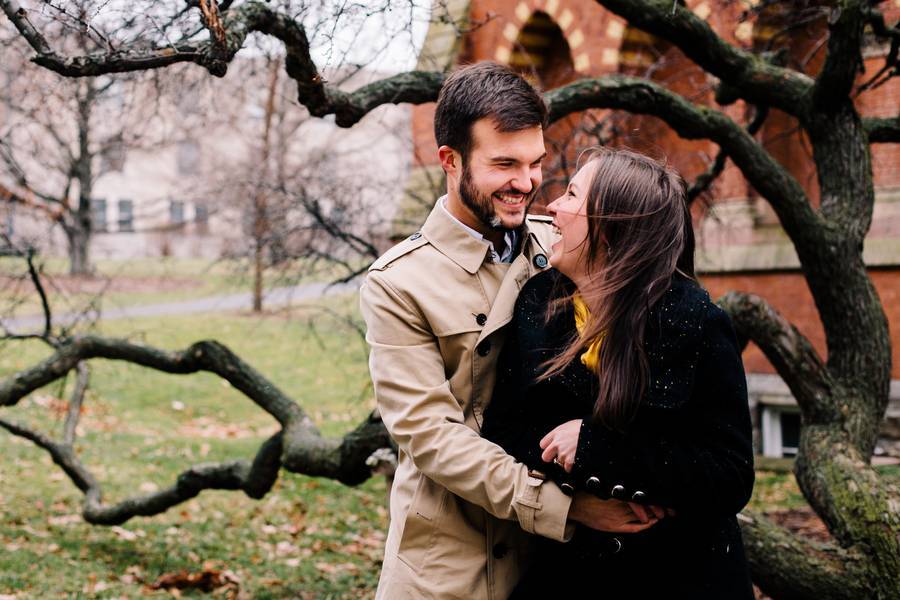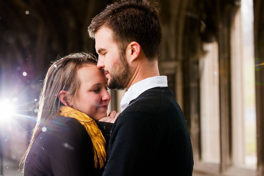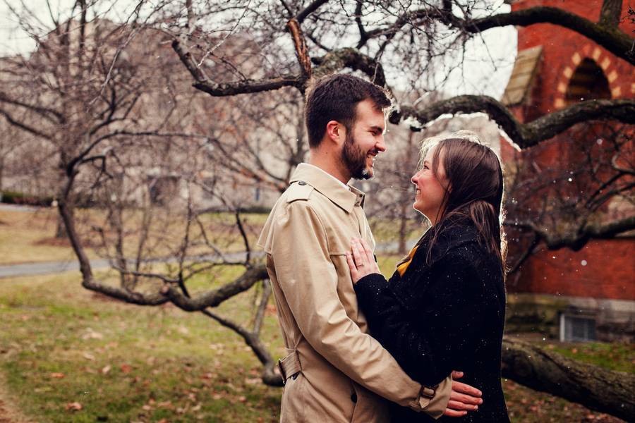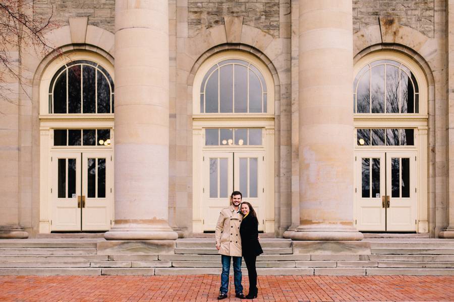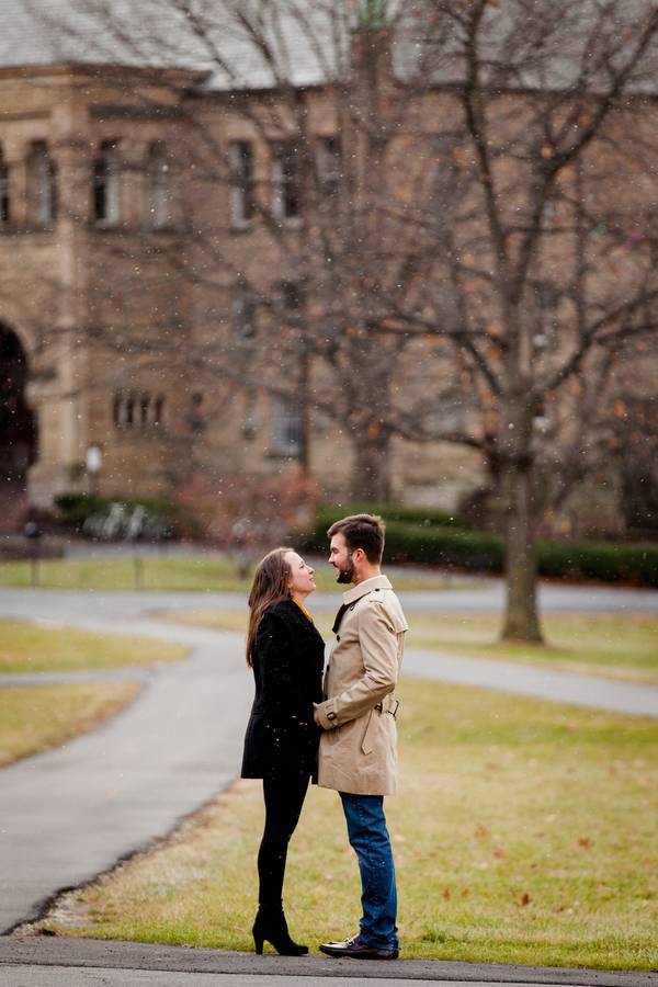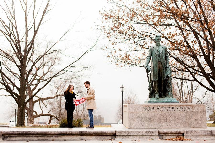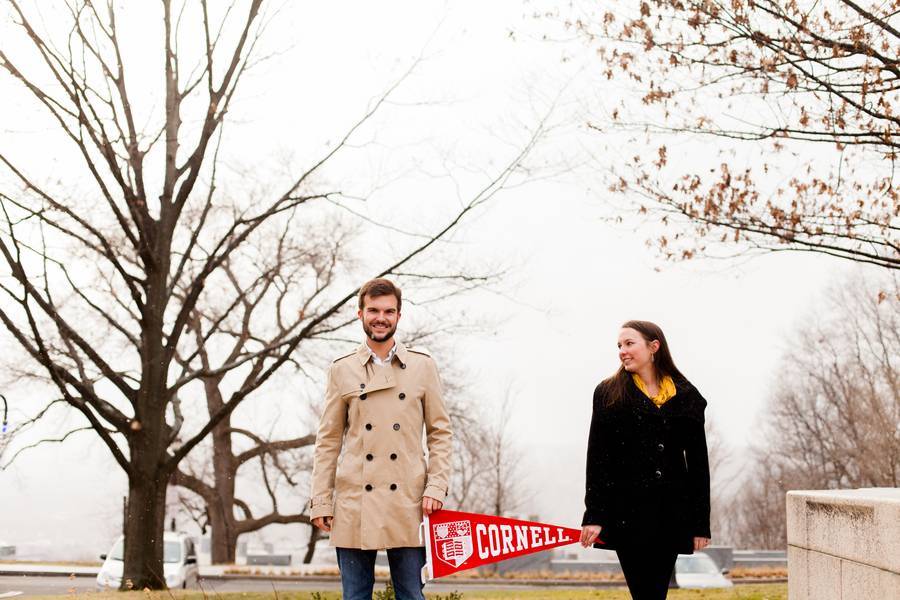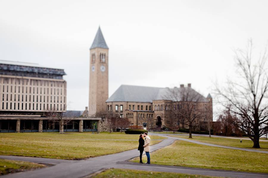I knew that there was abundant opportunity to capture beautiful backgrounds at Cornell, so I wanted our clothing to be mostly neutral. Rather than being too “matchy-matchy,” we wanted to dress in a way that made us feel most like ourselves. Other than my coat and scarf, everything we wore was something we owned before we even got engaged! I was very happy with the result – now, anyone who looks at the photos will see Kyle and me as we might look on any given day.