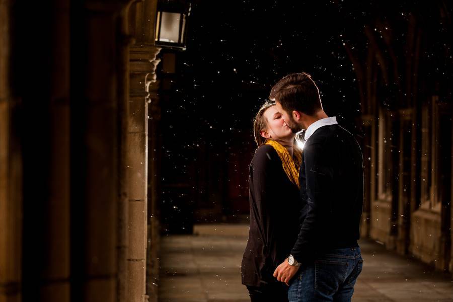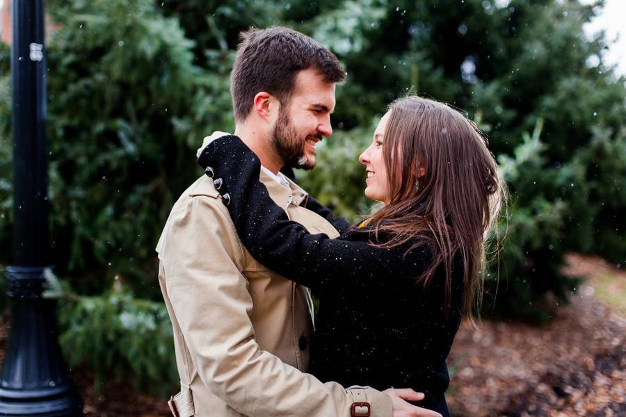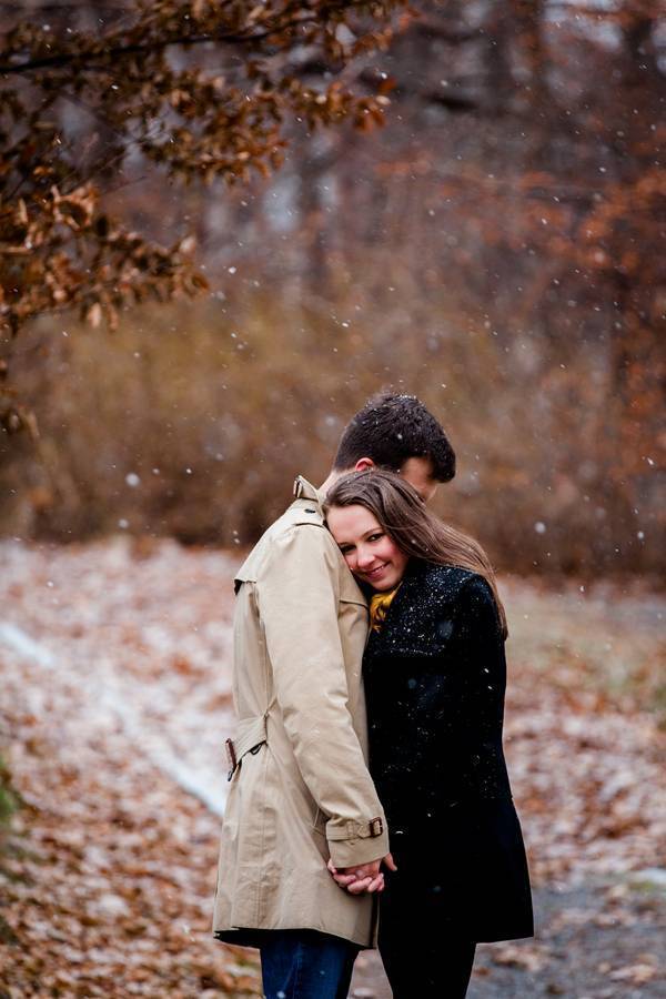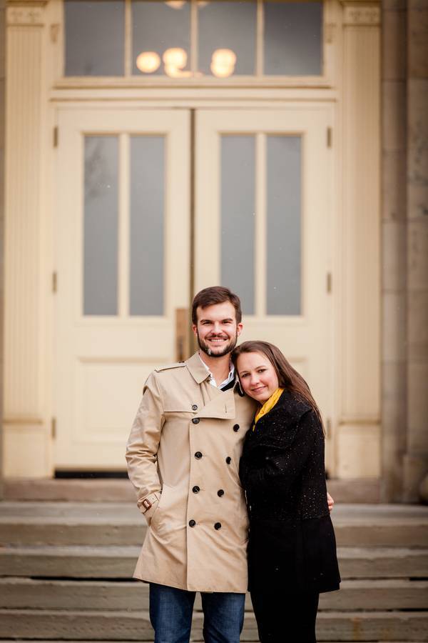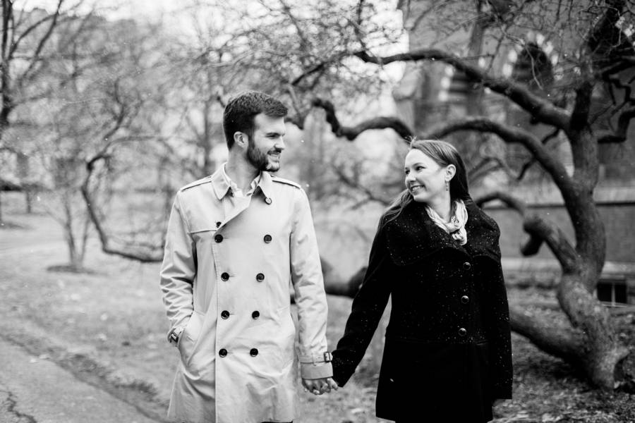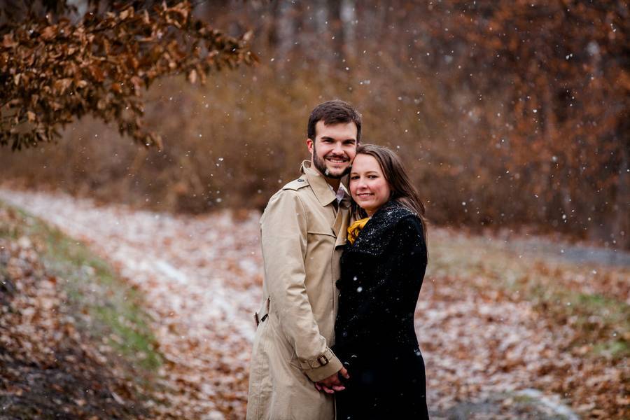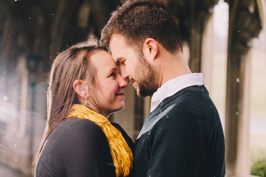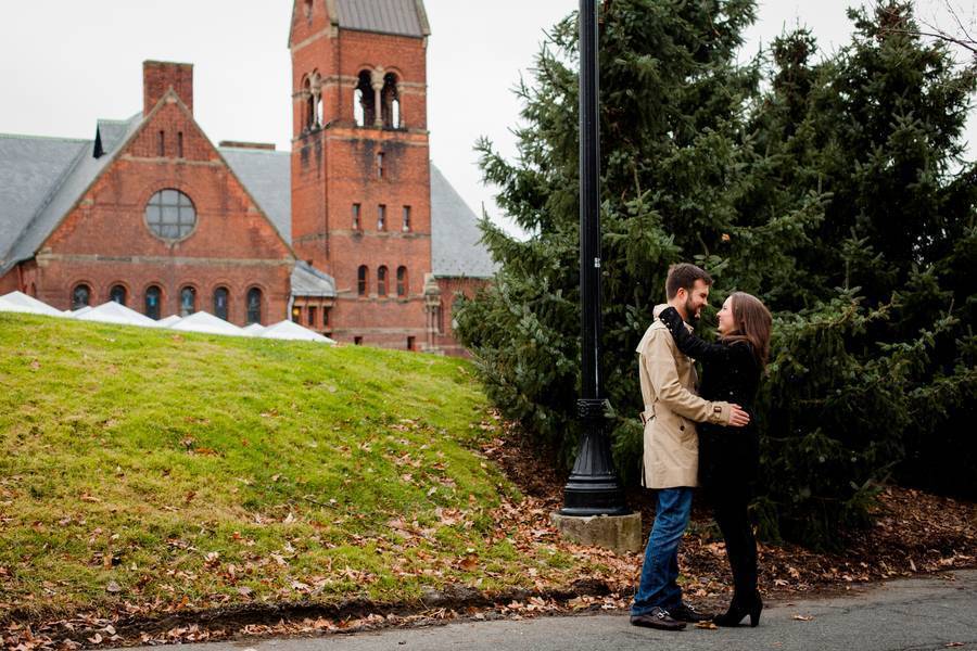 I knew that there was abundant opportunity to capture beautiful backgrounds at Cornell, so I wanted our clothing to be mostly neutral. Rather than being too “matchy-matchy,” we wanted to dress in a way that made us feel most like ourselves. Other than my coat and scarf, everything we wore was something we owned before we even got engaged! I was very happy with the result – now, anyone who looks at the photos will see Kyle and me as we might look on any given day.