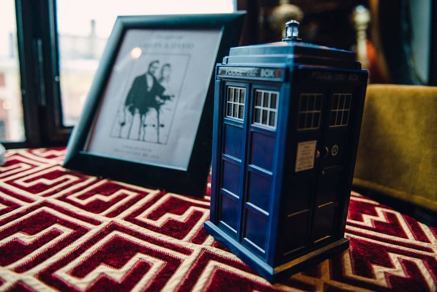 As mentioned before, the overall theme for the entire wedding was a “geek” wedding. There were Doctor Who TARDIS’ and Green Lanterns on the invites, programs, and other paperwork. TARDIS’ adorned the tables as centerpieces and general decor. The two love their geeky little fandoms and were happy to make it known on their special day.
