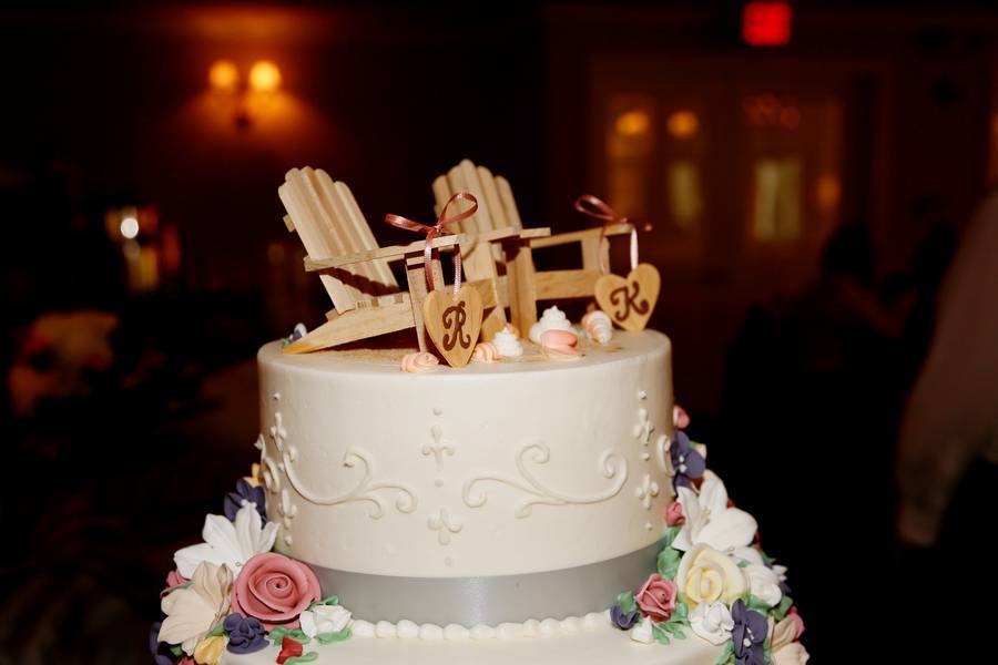 Purple, classic, elegant. Beach theme, since they worked in memorable things about them as a couple (beach chair cake toppers for their favorite vacation spot and as a nod to where they got engaged), sand dollars on the invitations and favors, etc.