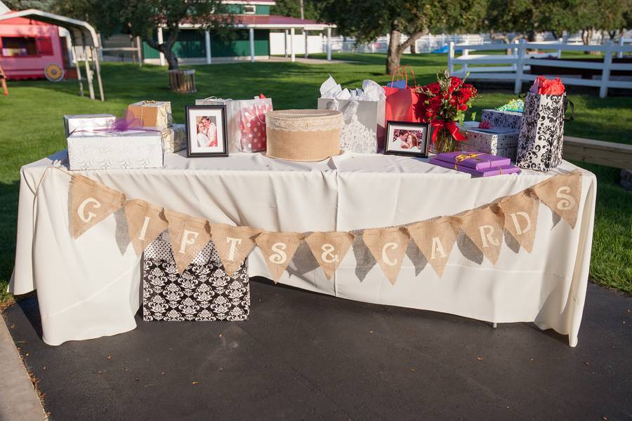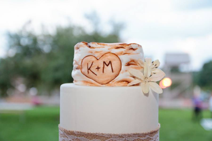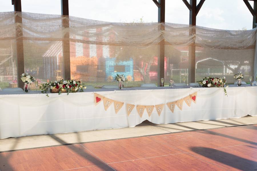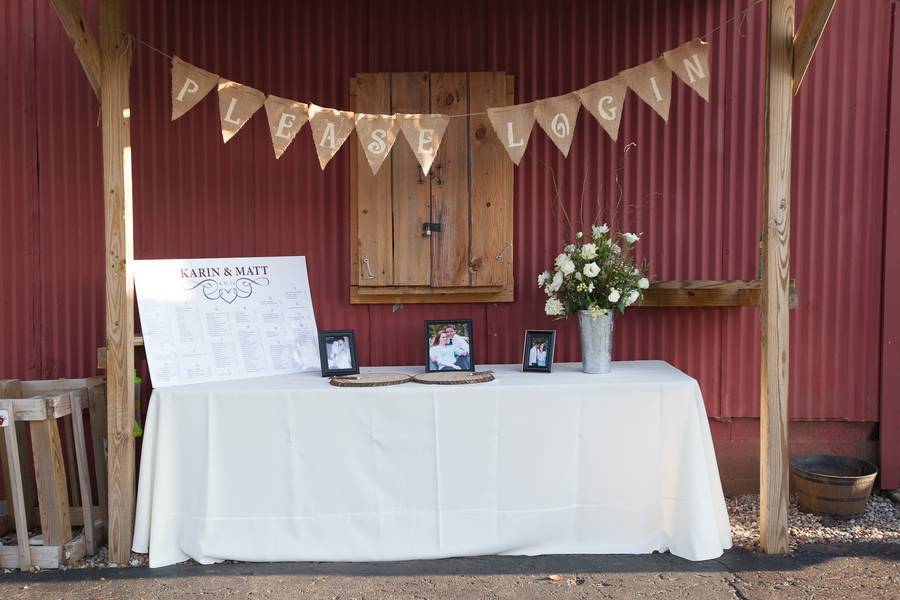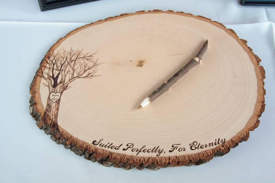 Karin’s mother played a large role in the decorations. They did many of the decorations themselves. They hung stringed lights and white fabric behind the wedding party table, have triangle garlands in front of the gift and seating chart tables. Although they didn’t make it themselves, one unique thing was a log guestbook, where the couple had guests sign a cut log circle.