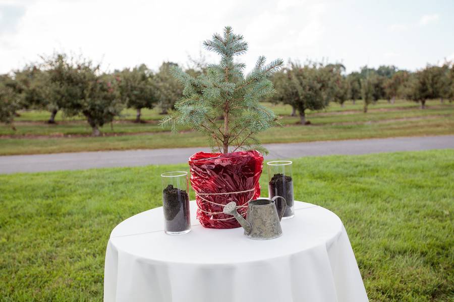 Ceremony- The beautiful backdrop of the apple orchard during the ceremony was just breath-taking. Also, the wedding party arrived at the ceremony in antique cars from her grandfather’s collection. The guests could see each car pull in to the orchard as the ceremony started. It gave the ceremony almost a Great Gatsby kind of feel.