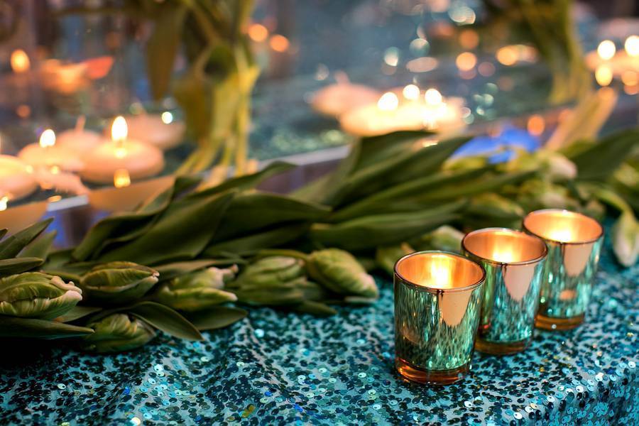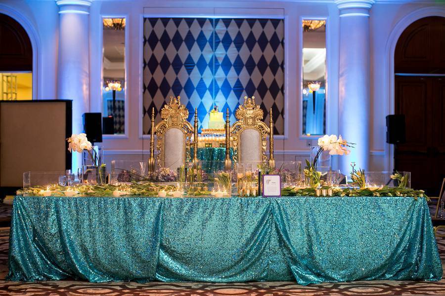 Décor: Peacock color themed, focusing on the bright electric blue and teals. Teal iridescent table cloths, with a mix of rounds and family style rectangle tables. Centerpieces were modern looking glass vases with bright purple, green and white orchids and lilys standing tall. The head table had a 6ft long trough of orchids weaved and floating in water and a teal sequince table cloth. Tea lights surrounded the room. The cake table was on a riser, again surrounded by hundreds of tea lights. The peacock colored cake was topped with a bride and groom doll custom painted to match their reception outfits. In the spirit of our name, we had a gummi bear jar with a sign that said “Enjoy some gummis from the Gummis”.