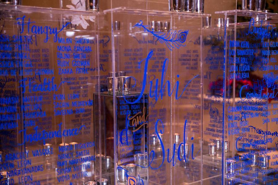 Escort table: Plexi glass sheets with guests names hand written in a bright blue ink. Tables were arranged by “relationship characteristics” such as trust and share. Each table name was hand made with a peacock sketch and backed on teal and purple paper. On each guest table, the table name was displayed with the meaning of the characteristic to the couple.