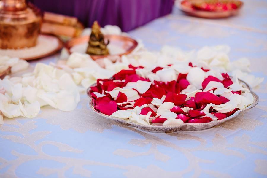 Food: Cocktail hour – traditional Indian snacks in a bite sized fashion, spicy tomato soup shots and Indian vegetable Pav Bhaji bruschetta. Dinner – traditional menu, from the salads to chutneys, entrees and desserts. A variety of south and north Indian menu. Spiced just enough to remind the guests they are at an Indian wedding! The variety and taste fulfilled the newly wedded couple’s foody needs.