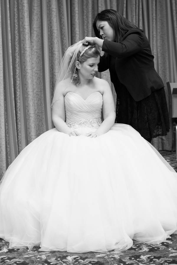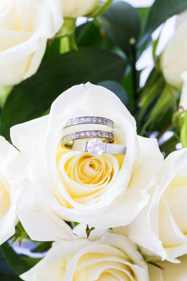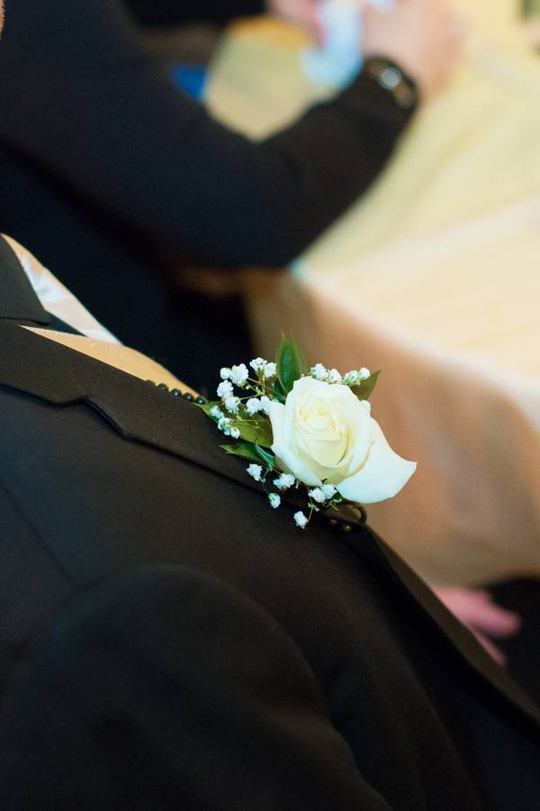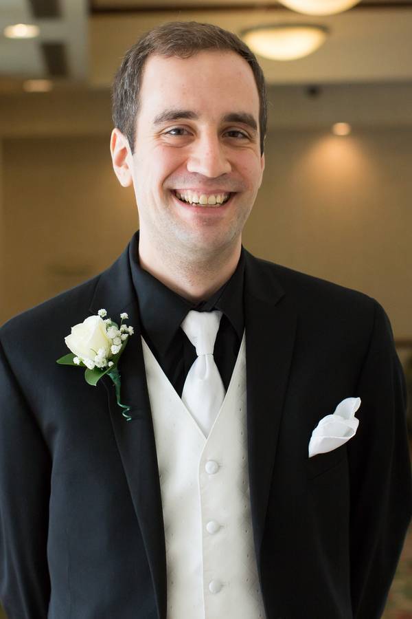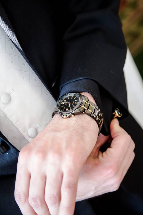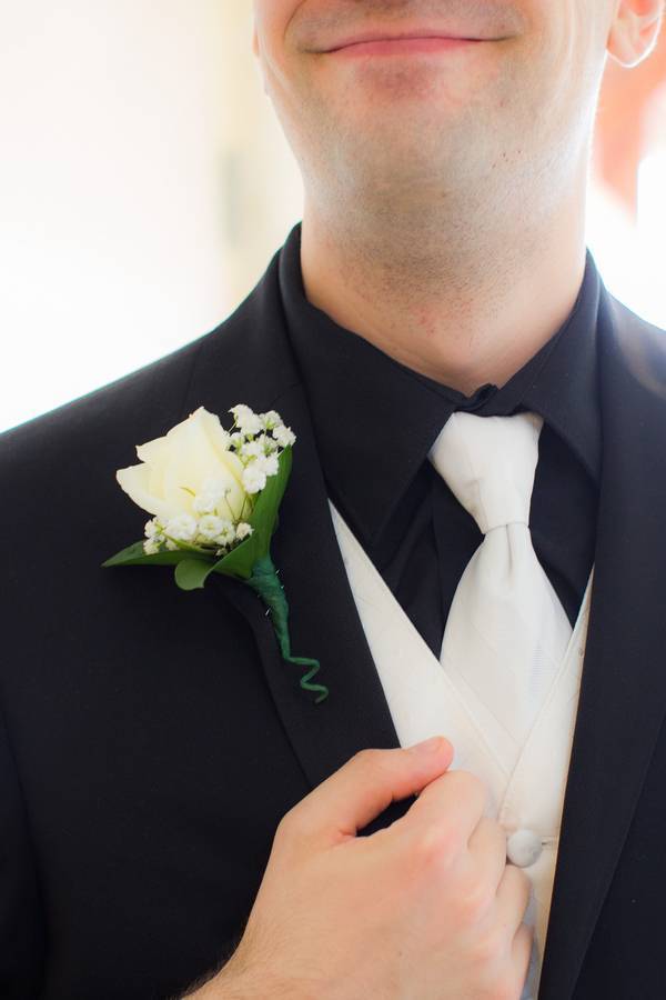 Jesse’s look (and the groomsmen in general) came about sort of randomly. We knew we wanted mostly black, to match the bridesmaids’ dresses, but wanted gold for the ties and vests. The question then came, how would Jesse stand out from the groomsmen. That’s how we chose a white tie and vest for him. Once we saw it all together at the shop, we knew it would be a good choice.