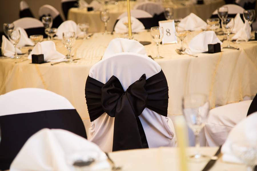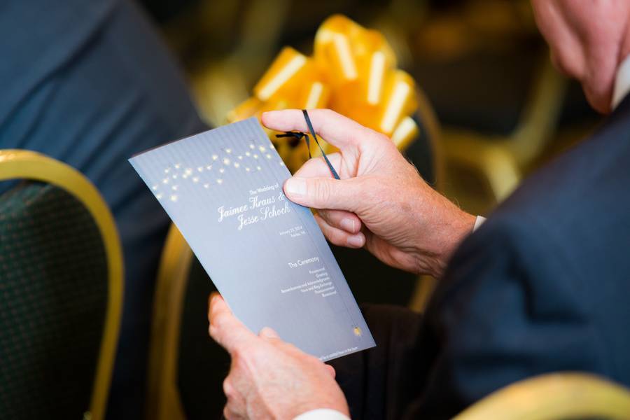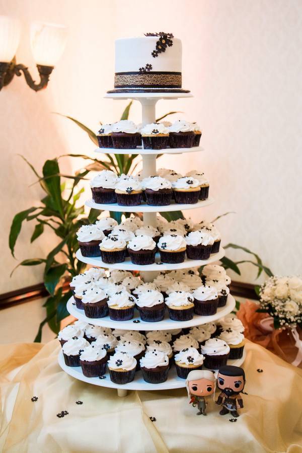 We chose black, gold, and white as our color palette because again, it was classic, and we figured it would be really easy to find things in those colors. Also we’re big Pittsburgh sports fans, so we had a little shout out there. A shared hobby of ours is gaming, of both the board and video varieties, and it’s something that we’ve grown to love together, so we wanted to incorporate that somehow into the wedding without hitting people over the head with it. The biggest way we did this was with the invitation suite, which we designed ourselves using Adobe Illustrator. We also incorporated game elements into the escort cards and favors.