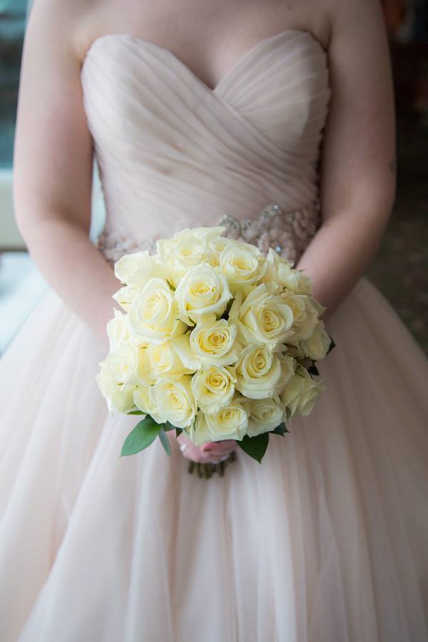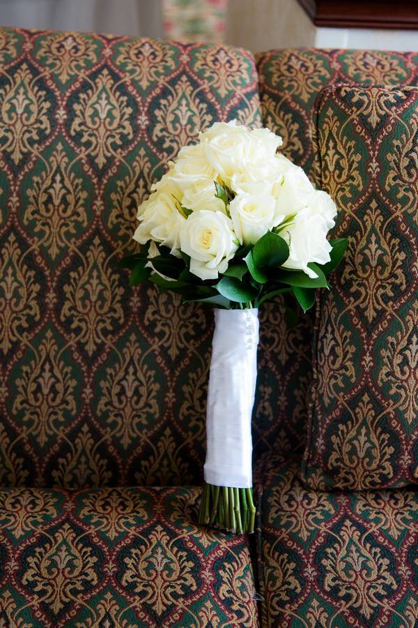 Neither of us had strong feelings about flowers. When picturing my wedding, I was never picturing myself holding a specific flower or being surrounded by large arrangements. We really cut some corners here by only having my bouquet, boutonnieres for the groom and groomsmen, and a few “centerpiece” bouquets scattered around for table decorations. We also decided to use a chain store since again, we didn’t really care. Wegmans offered us a great package that was in our budget and allowed us to get a couple extra boutonnieres for the dads and corsages for the moms, as well as a toss bouquet. For the bridesmaids, I bought them custom made gold and white clutches as their present, which they carried down the aisle instead of flowers.