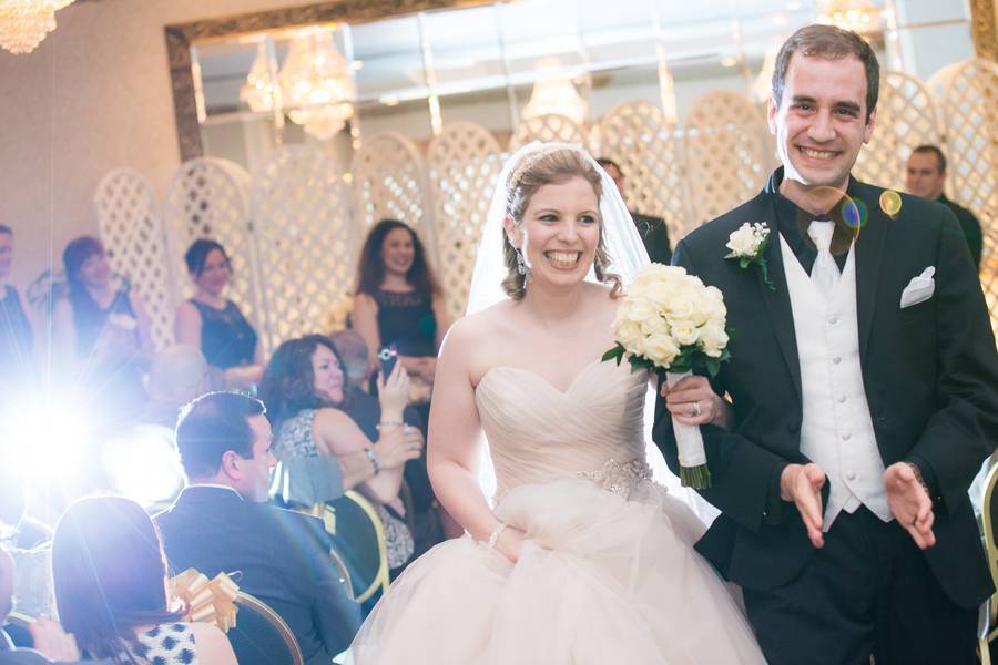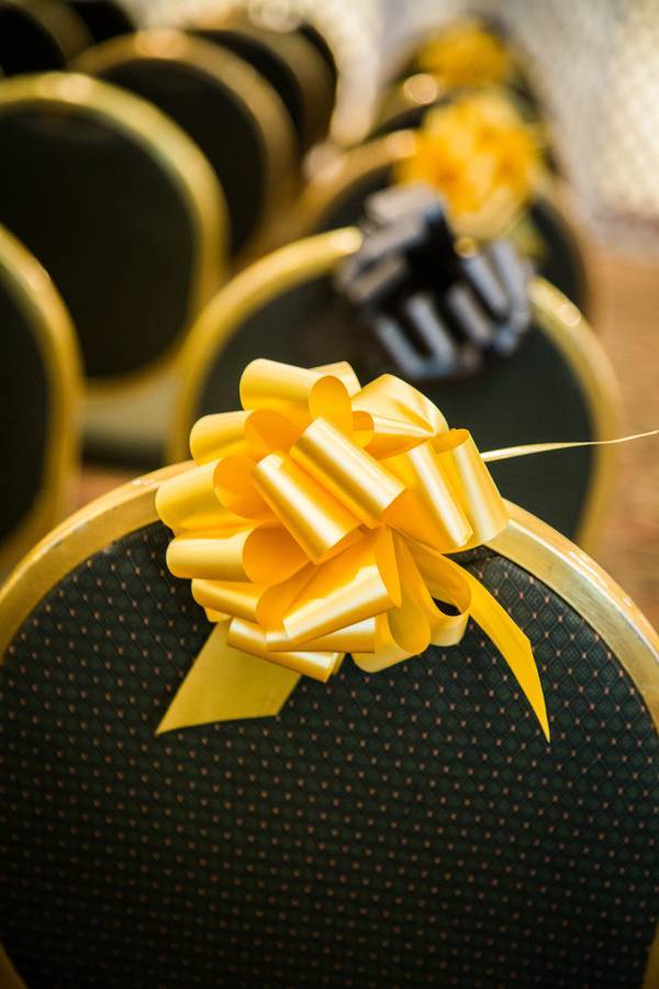 My mother-in-law surprised us by using gold and black ribbon and extra jingle bells to create little bell rings that people could shake as we were exiting the ceremony. On our RSVP’s we had given the option “Yes, with bells on,” so literally people had bells on at our wedding. It was a cool surprise.