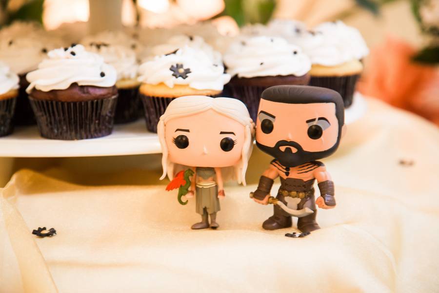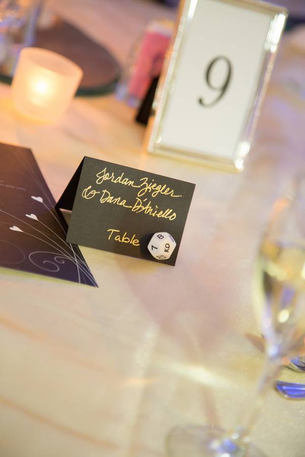 We used black place cards and gold embossing materials to create our escort cards. Instead of just writing the table number, we used 12-sided die to indicate what table a couple was sitting at. This was another subtle way for us to incorporate gaming.