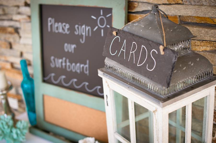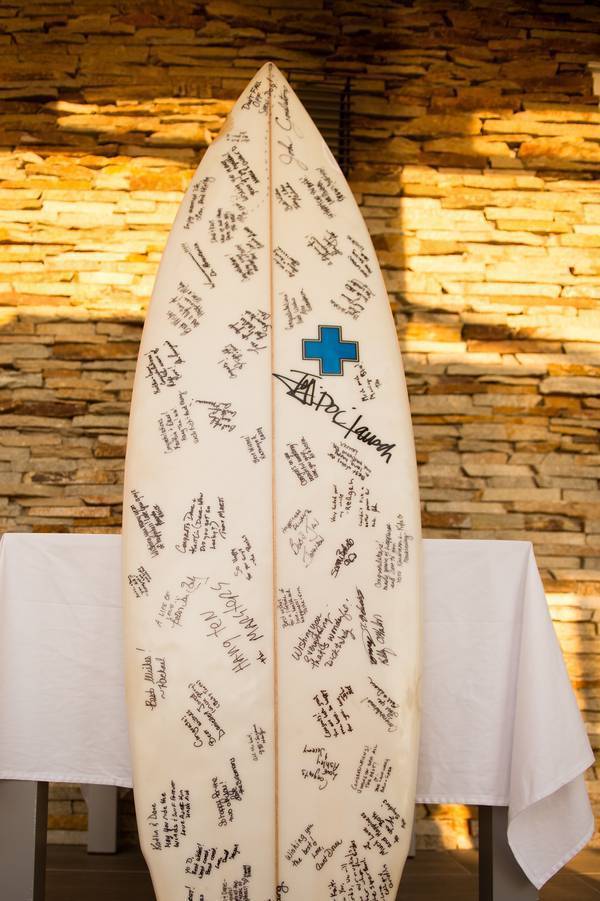 The card table and surfboard which served as their guestbook.