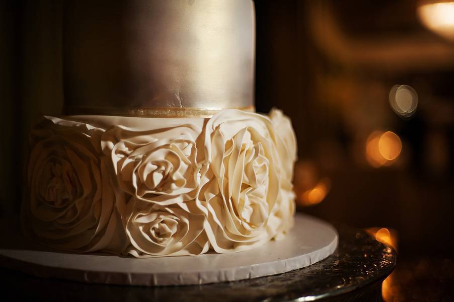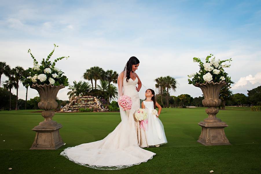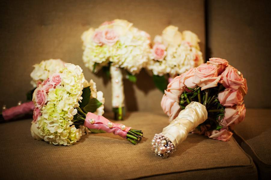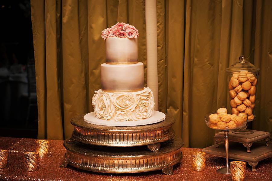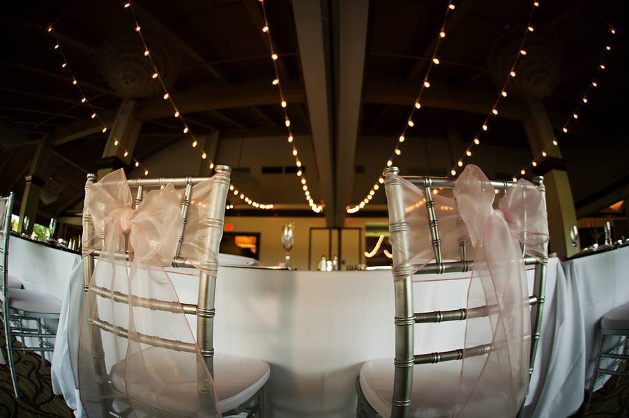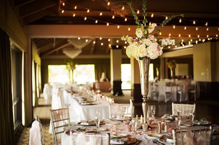 The bride’s family is Italian so I was inspired by photos of Tuscan Gardens. Our ceremony was on a beautiful green golf course with open blue skies. For the reception, I included strands of garden lights draped above the dance floor, classic pieces like the tall silver vases and candle votives, bright white table clothes and silver chargers, we mixed in silver Moroccan lanterns for fun, and rich greenery like lemon leaf for the centerpieces and accent greenery inserted in the table napkin, and lush white chocolate roses, blush garden roses, pink spray roses, and white hydrangeas.