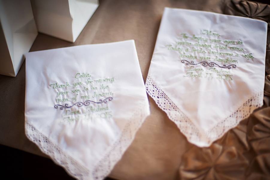 Yes, the gift bags and boxes- bright white bags and boxes, mint green doilies, and silver accent bow the menu cards- shimmering pearl white card stock with classic black cursive writing, the sign-in table décor, rustic picture frame with engagement pictures and our favorite pics, shimmering pearl white place cards with standard black cursive, the memorial table décor- 4 silver beaded frames with restored 8×10 photos of our grandparents and Gaston’s father. We placed rose scented candles in the votives on the reception table, the room smelled like a rose garden. It was just heavenly! And we added hanging crystals from center pieces!