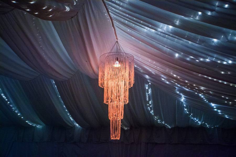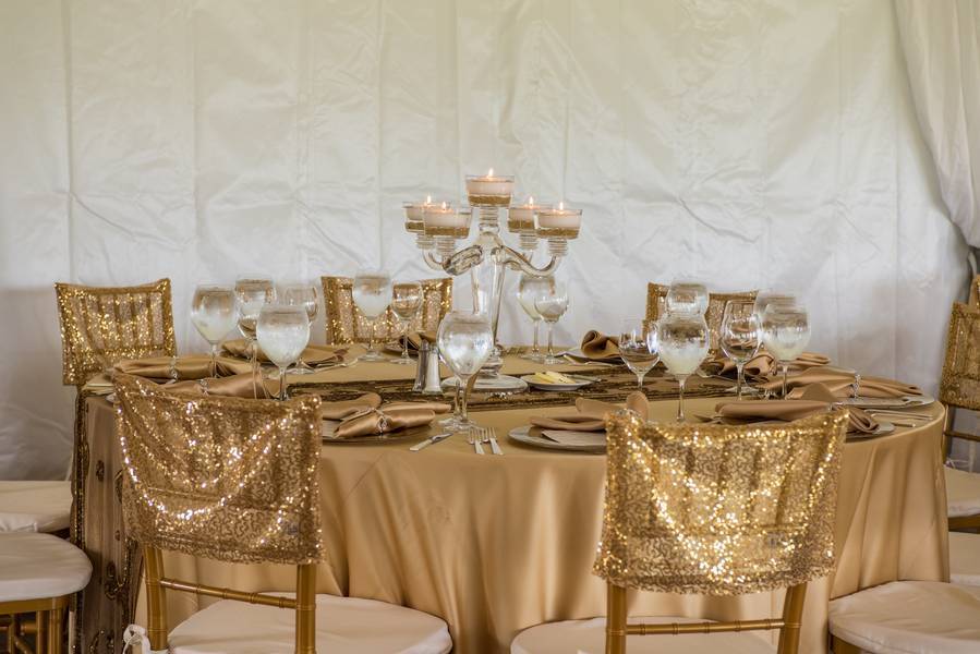 The place settings. Staying true to their theme — classic and elegant — they had a tent with a full hardwood floor, draped ceiling, two large crystal chandeliers with elegant gold and crème décor. With simple beaded table runners with a large glass candle holder for each table.
