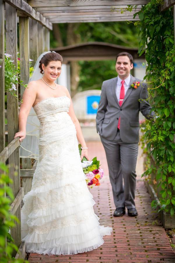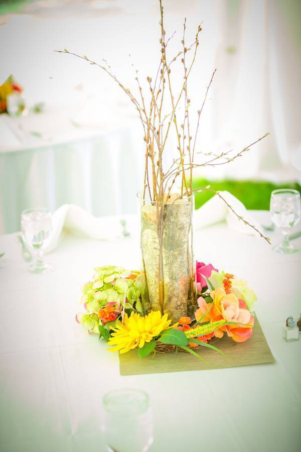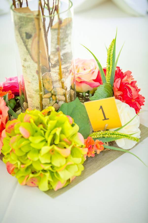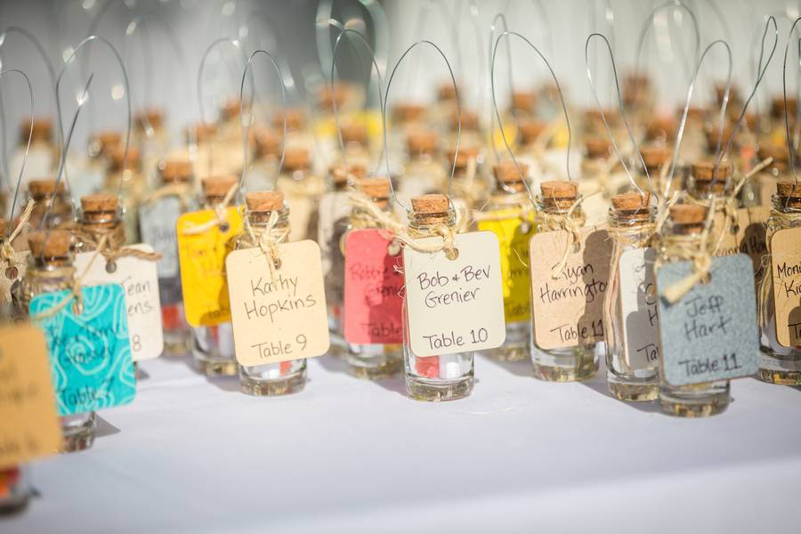 The centerpieces and favors were all handmade my the groom’s mother. The favors included a “message in a bottle” thanking the guests for sharing in the special day. The groom’s mother also made an alternative “letter in a jar” guest book where guests wrote notes to the bride and groom and placed them in a large mason jar to be opened and read on their one year anniversary.