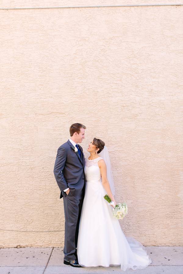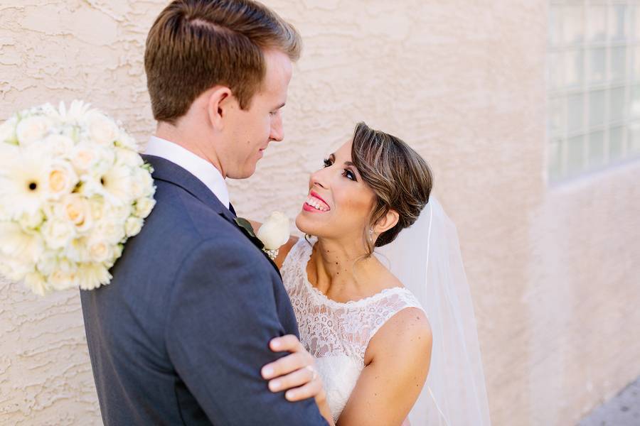 As a photographer, my first job is to photograph the day as it unfolds naturally; however, it’s also a main priority to curate a beautiful scene. Josh and Dawnielle were married in early October in Mesa, Arizona where the sun never ceases to shine. During their brunch wedding, our outdoors photo locations were limited, so we chose to host their first look at the ceremony site, a beautiful white room lined with exposed brick. A first look is meant to be as special, and even more intimate, than a first look at the ceremony, and these two didn’t disappoint. They shared laughter, hugs, and kisses as they embraced one another for the first time on their big day. It was a beautiful moment to witness as it unfolded.