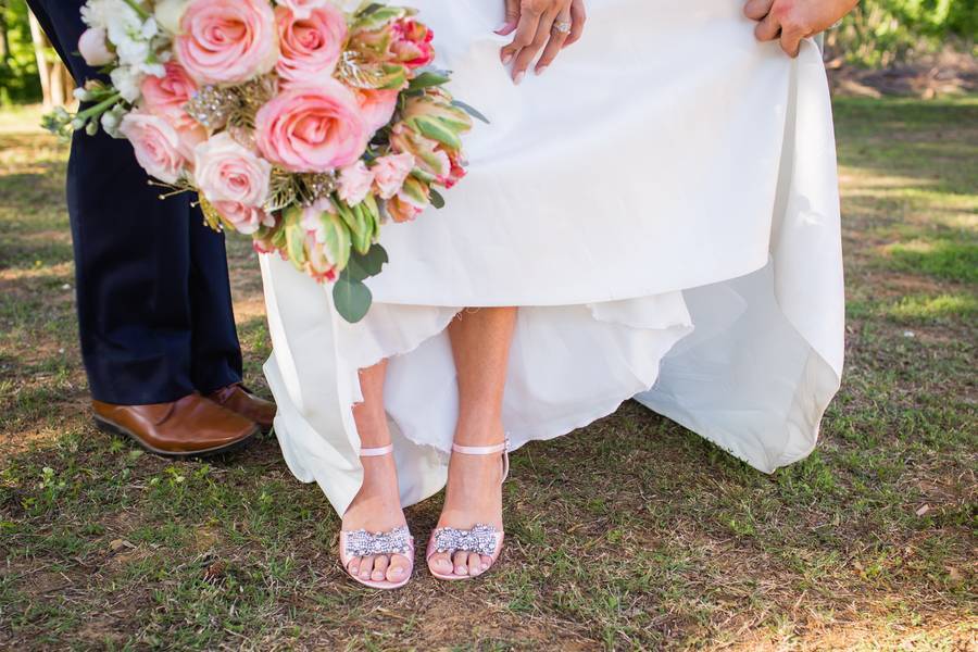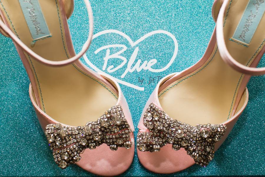 The bridal shoes. Kristen’s pink wedding shoes were bedecked with rhinestone bows. The company name is Blue.