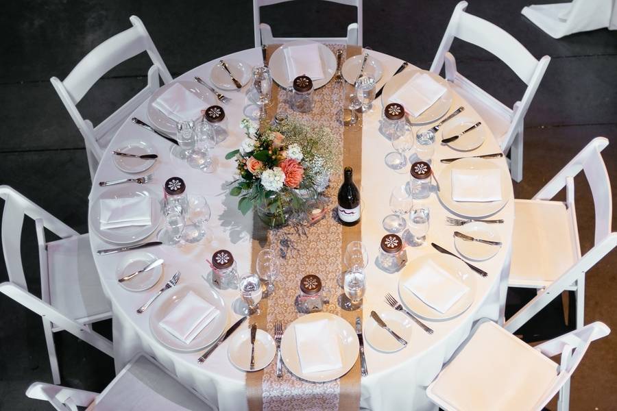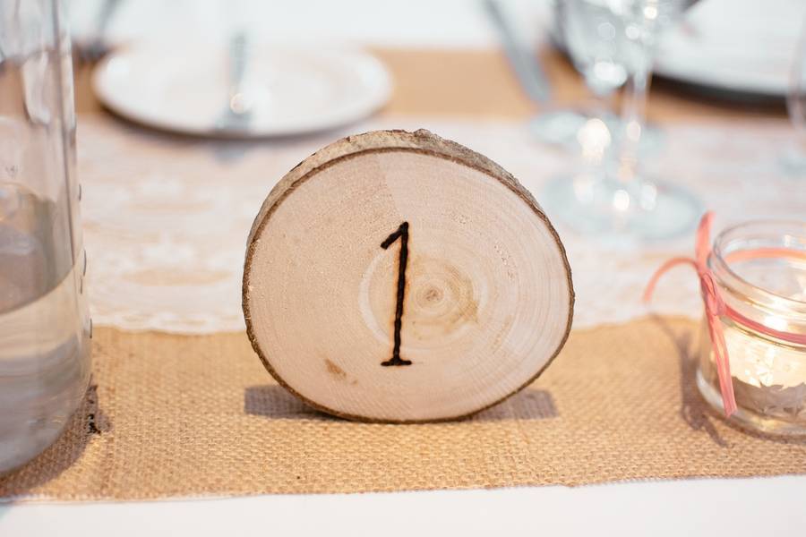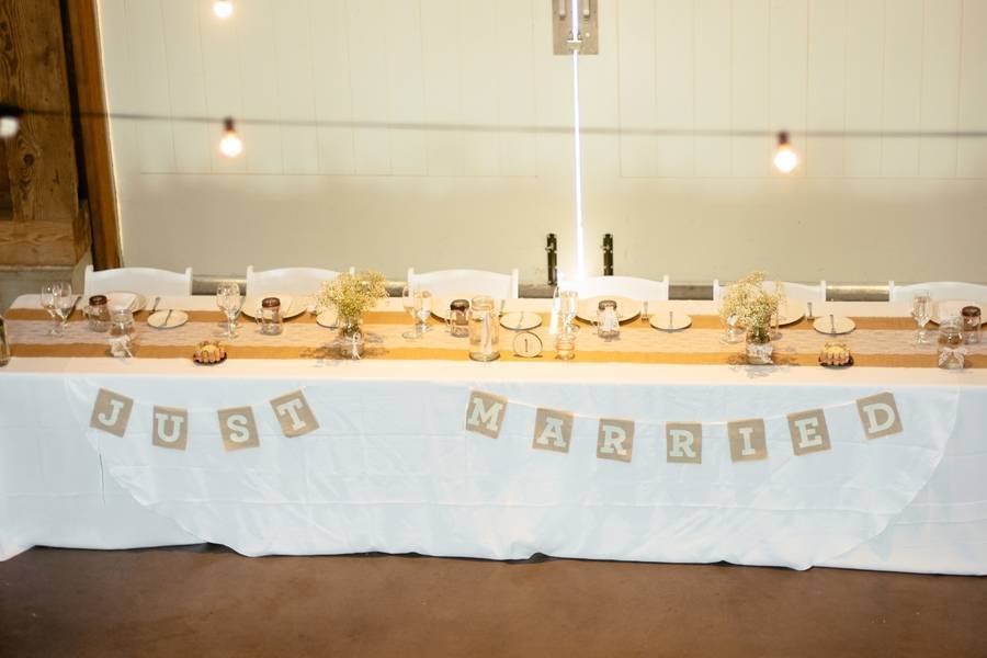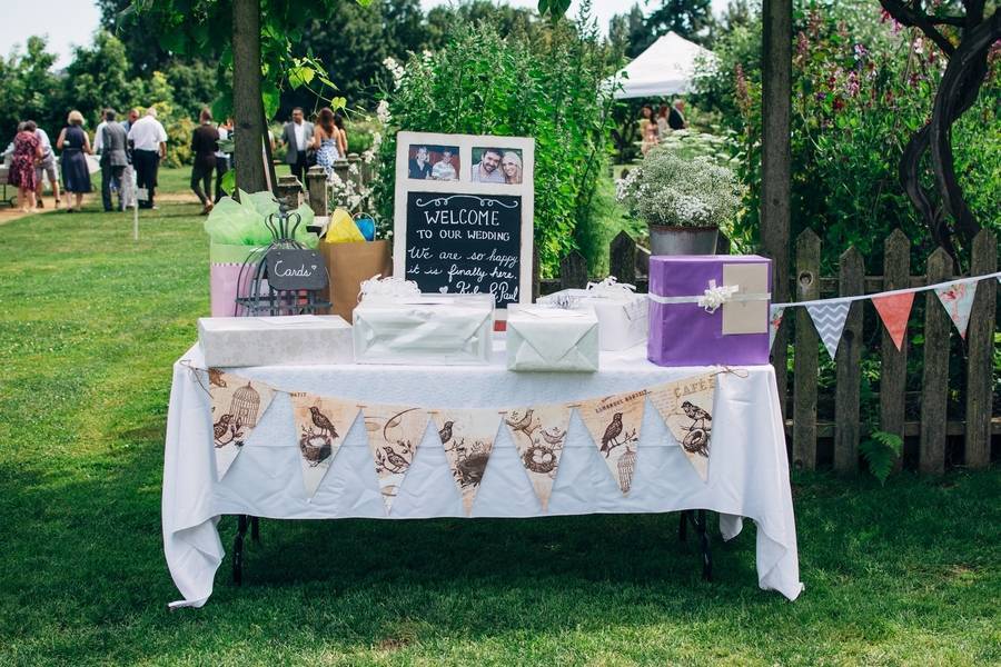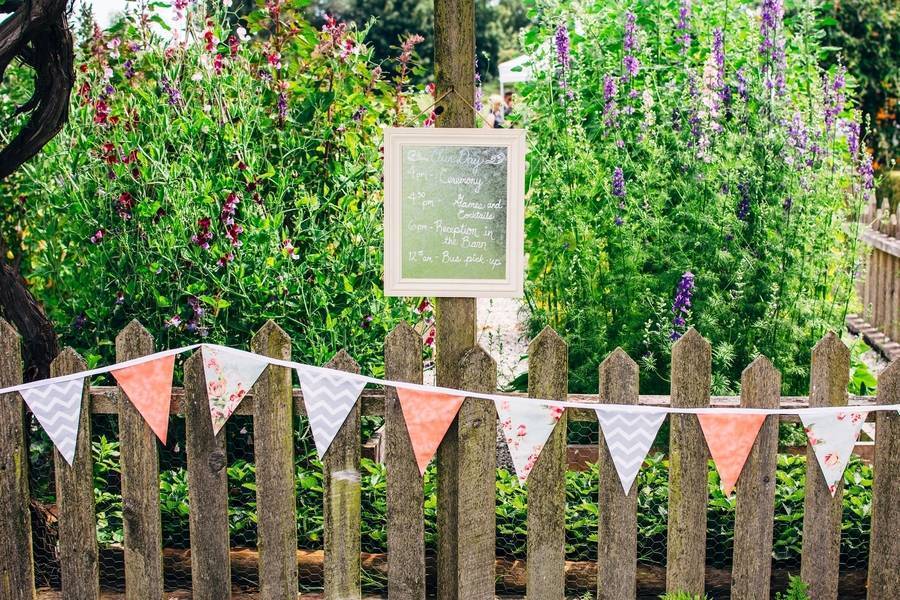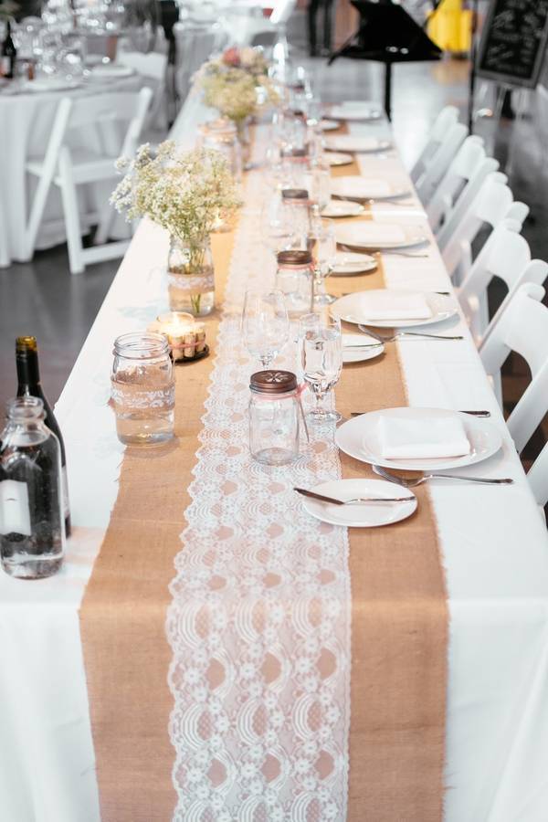 bunting, burlap table runners, chalkboards, name tags, invitations