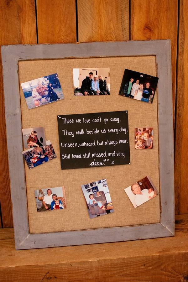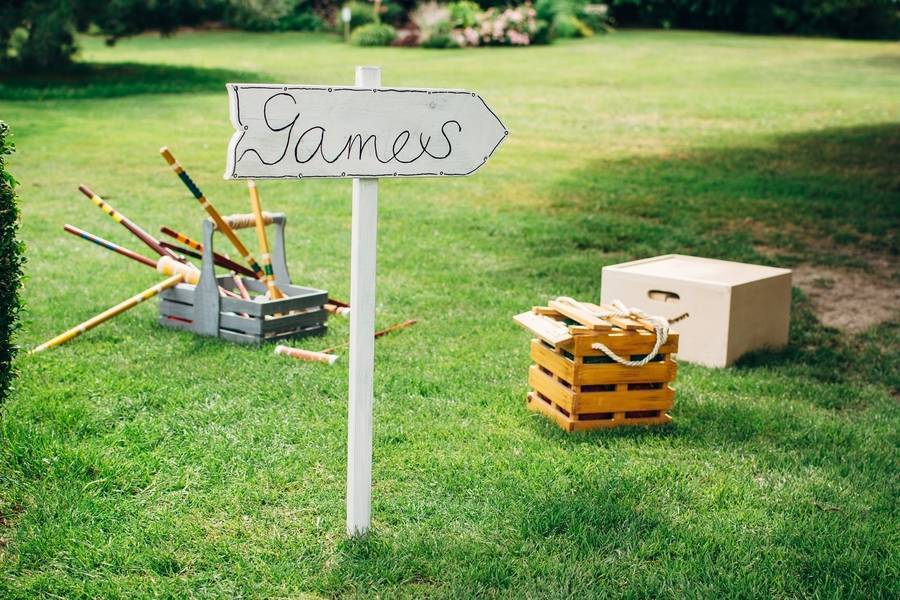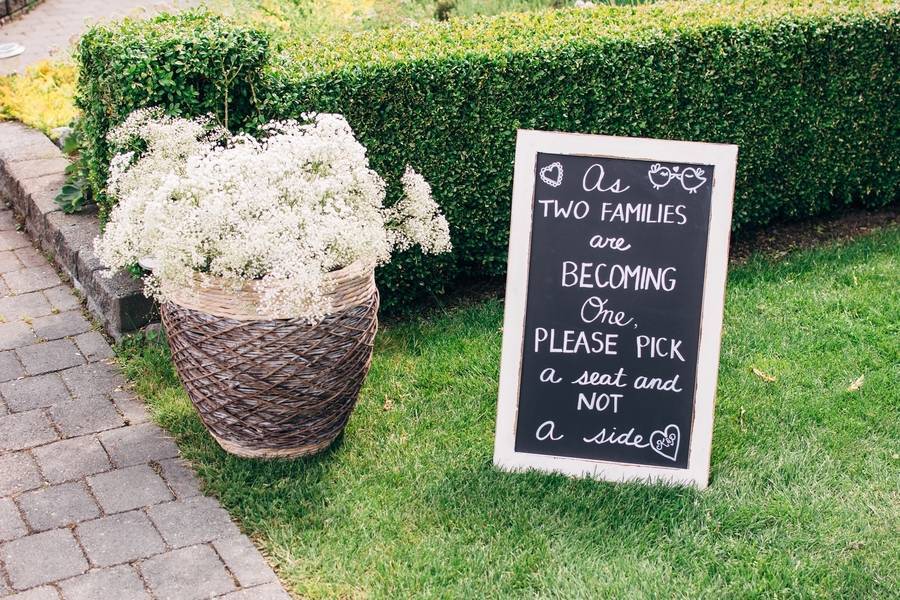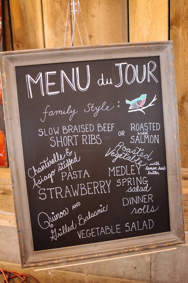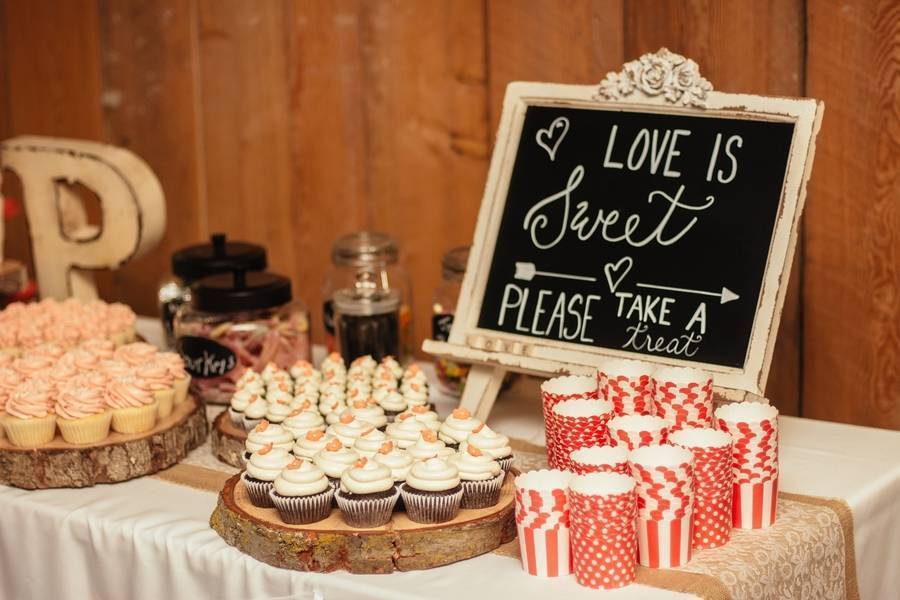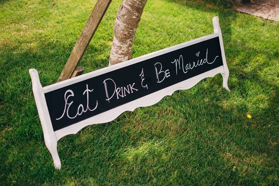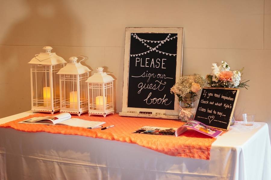 bunting, burlap table runners, chalkboards, name tags, invitations