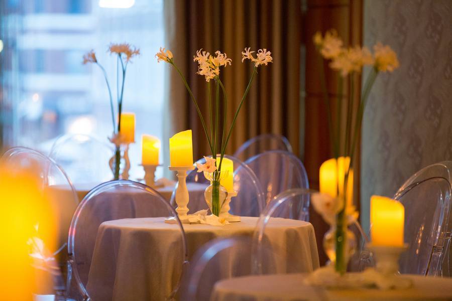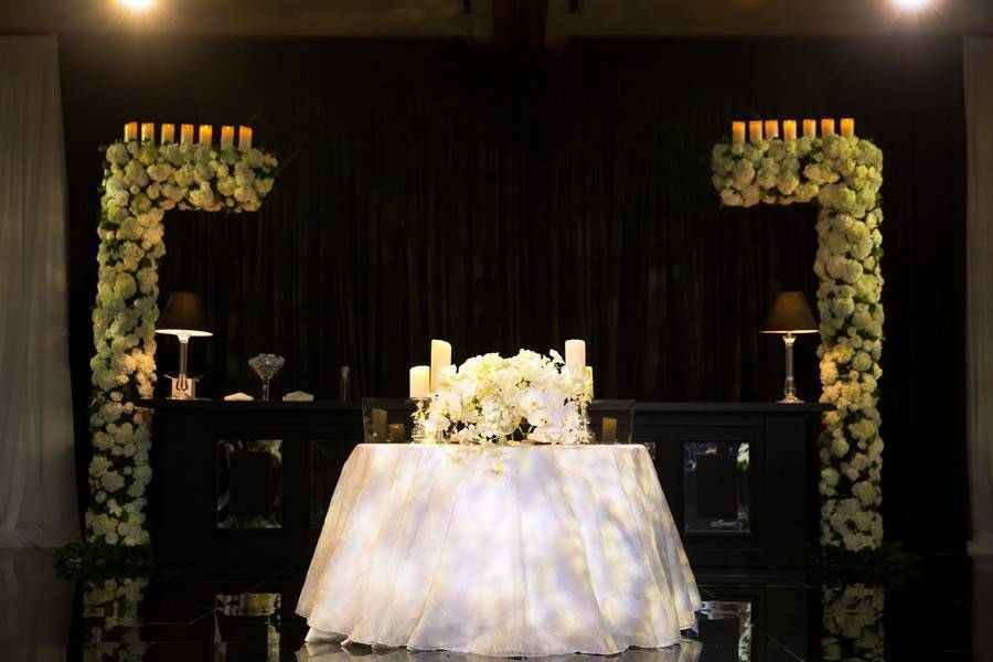 The goal for the decor was modern, dramatic, unique, romantic, dreamy. The flowers were my favorite part. The chuppah was a large structure filled with white roses. The table centerpieces were all different. Some were candelabras with flowers wrapped and draping down to the table.