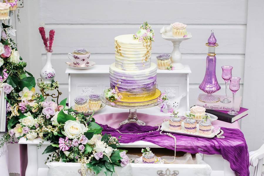 The intricate details on the rose cupcakes are reminiscent of the vintage tea sets, and all the desserts are also designed with pops of violet and blush. This delectable table left me drooling over the buttercream cake in violet ombre watercolor. The intricate details on the rose cupcakes are reminiscent of the vintage tea sets, and all the desserts are also designed with pops of violet and blush.