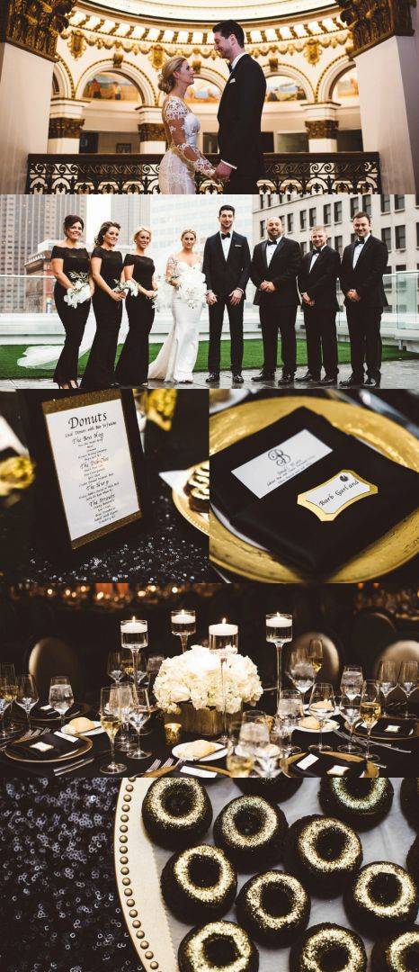 I love everything about this classy color palette. The combination of gold, ivory and black is stunningly gorgeous, taking the luxurious shimmer of classic romance into the avenue of modern style. Every detail goes well with black suits, elegant bouquets, gold flared plates and your stunning white wedding dress. Even the donuts are topped with golden sprinkles.