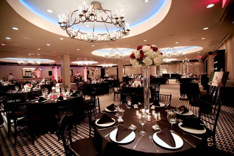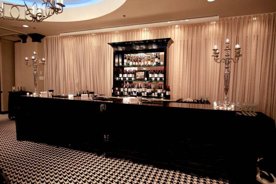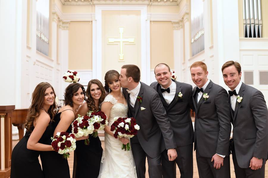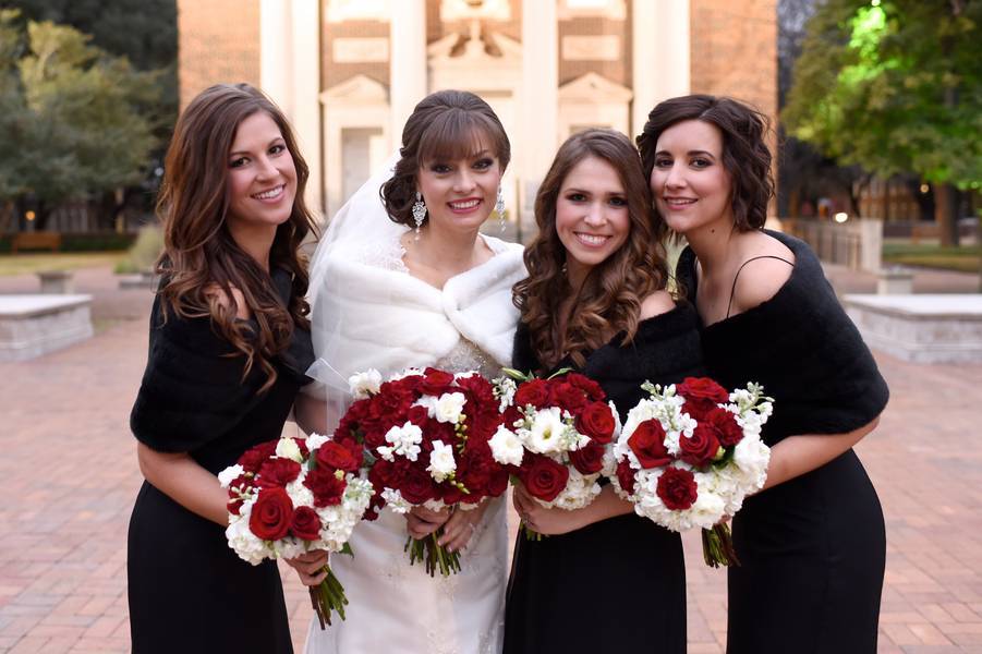 The bridal party look. Bridesmaids wore elegant black floor-length Jim Hjelm chiffon gowns. The bride gave each bridesmaid a black faux-fur stole for wear throughout the course of the evening. The groom and groomsmen wore dark gray suits from the Black by Vera Wang collection.