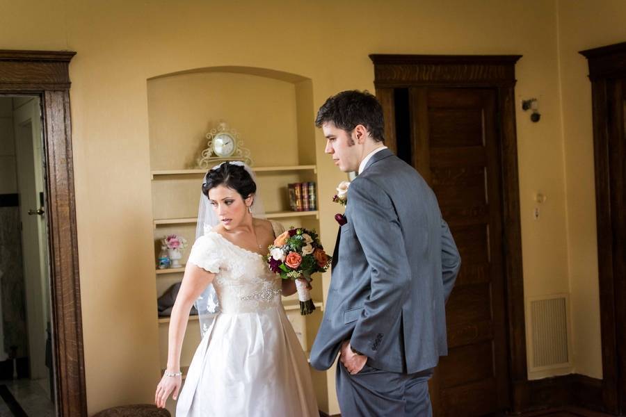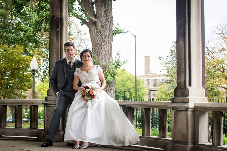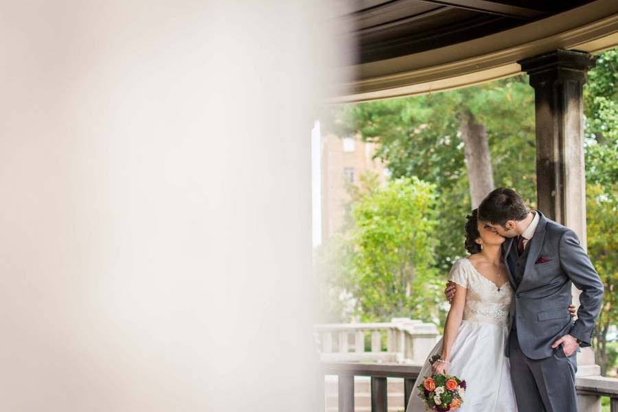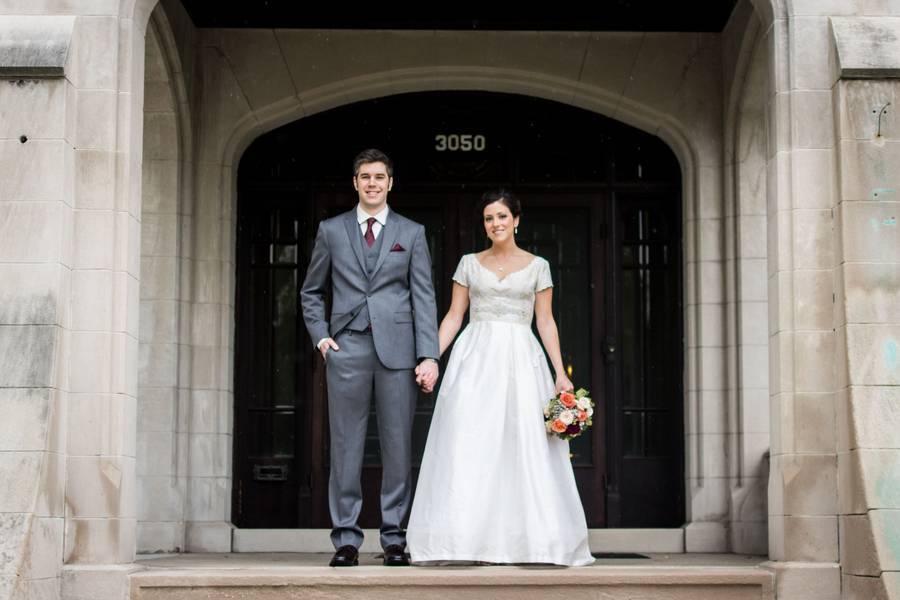 I didn’t want a strapless dress and could not find a dress I like in my budget. My wedding dress was designed based on a dress I had found online that is not commercially available. I found a local seamstress/designer that was able to work within my budget. I found the silk for the dress online, and we used the lace and buttons from my grandmother’s dress for the bodice. Steve chose his suit and went with gray. His accessories complimented my bouquet and our decorations.