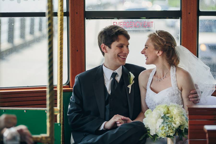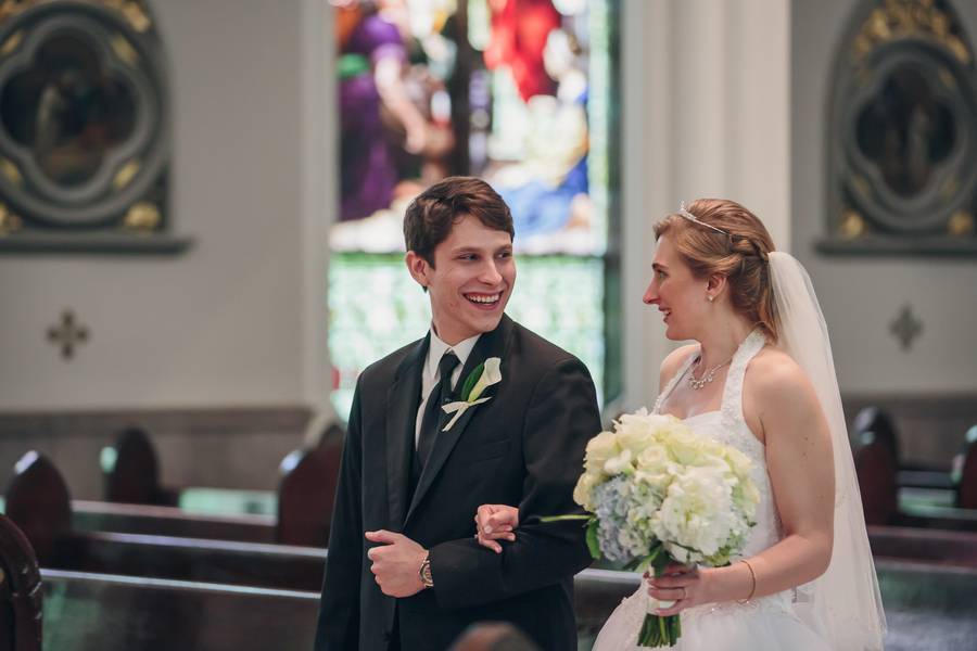 Our Wedding ceremony was a full nuptial Mass. After the Mass, we came back to the altar to sign our marriage certificate with our officiant, who is rector of the Cathedral. After getting married, the wedding party rode in a (very fun) trolley to White Point Gardens and the Charleston Battery to get some “just-married” photos. In the meantime, our other guests enjoyed a cocktail hour at the Francis Marion Hotel. Once we reached the hotel, the reception began and included first dances, a surprise father-daughter polka (very energetic!), dinner, a champagne toast, cake-cutting, and dancing. The evening ended with rice-throwing as we ran out of the Ballroom and out to the elevators.