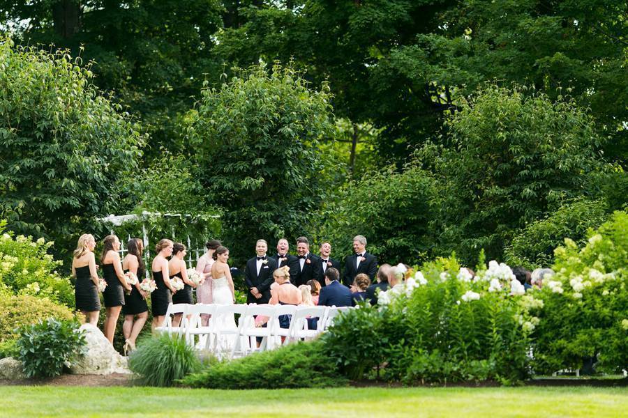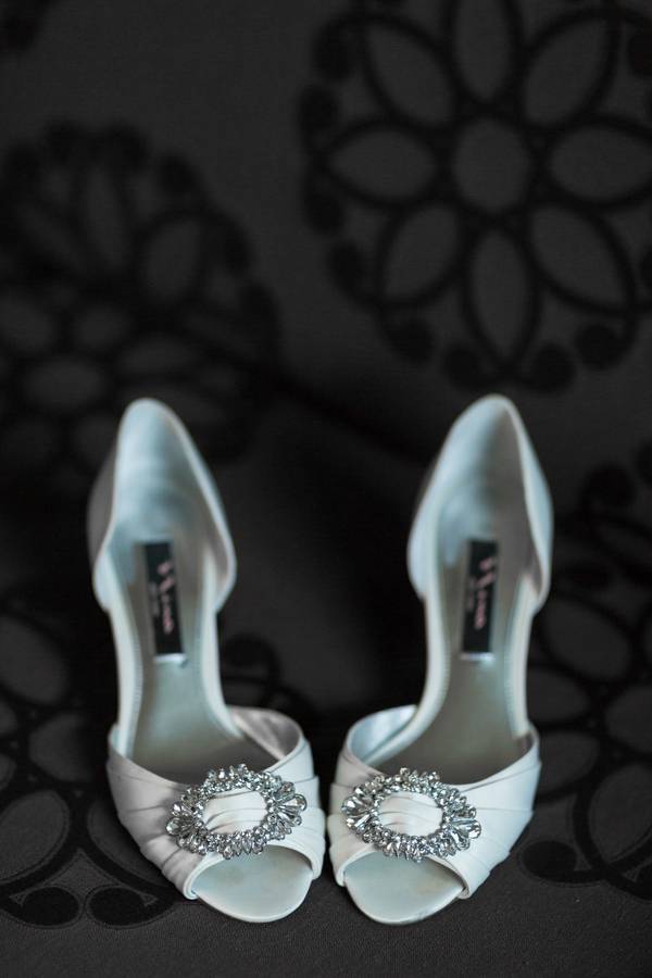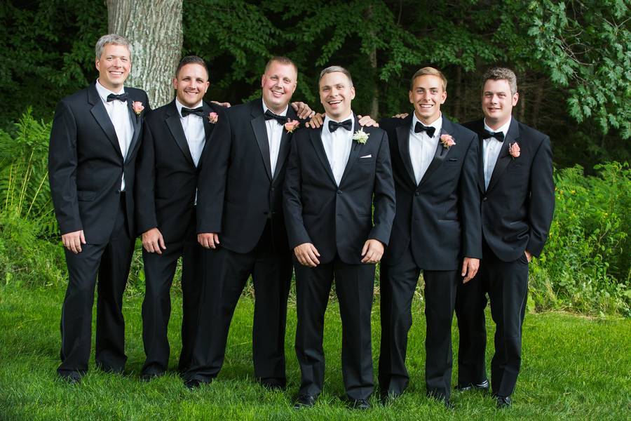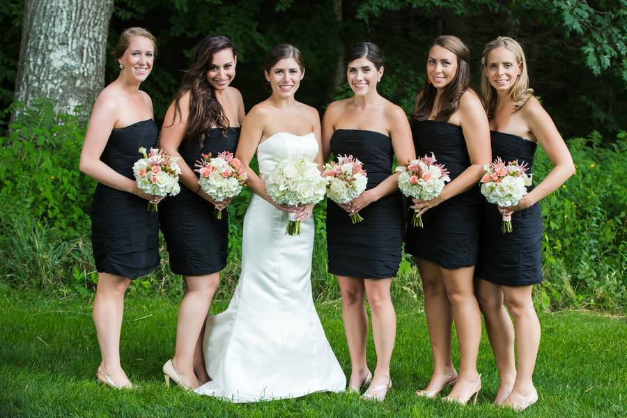 The Wardrobe: The bride wore a lovely fit and flare satin gown with a hint of sparkle at the waist while the groom and groomsmen all donned classic black tuxes. The bridesmaids were all stunning in black strapless knee-length cocktail dresses.