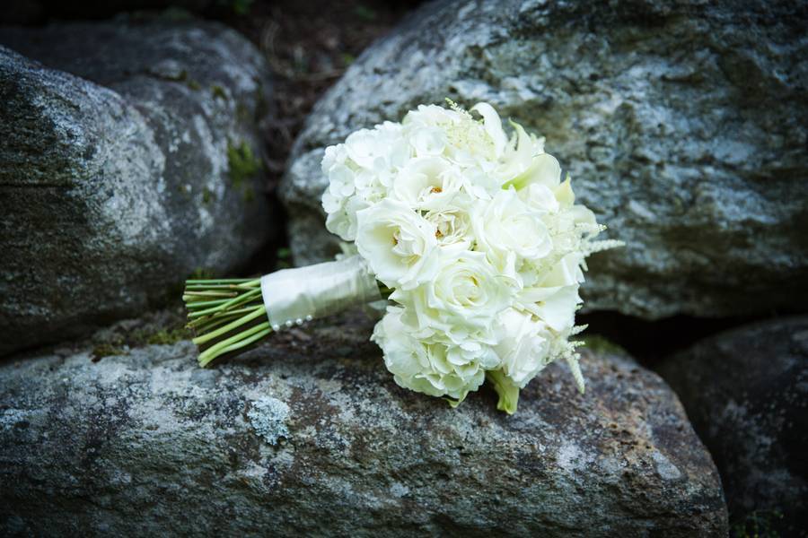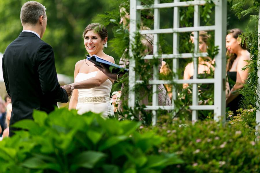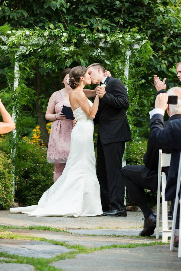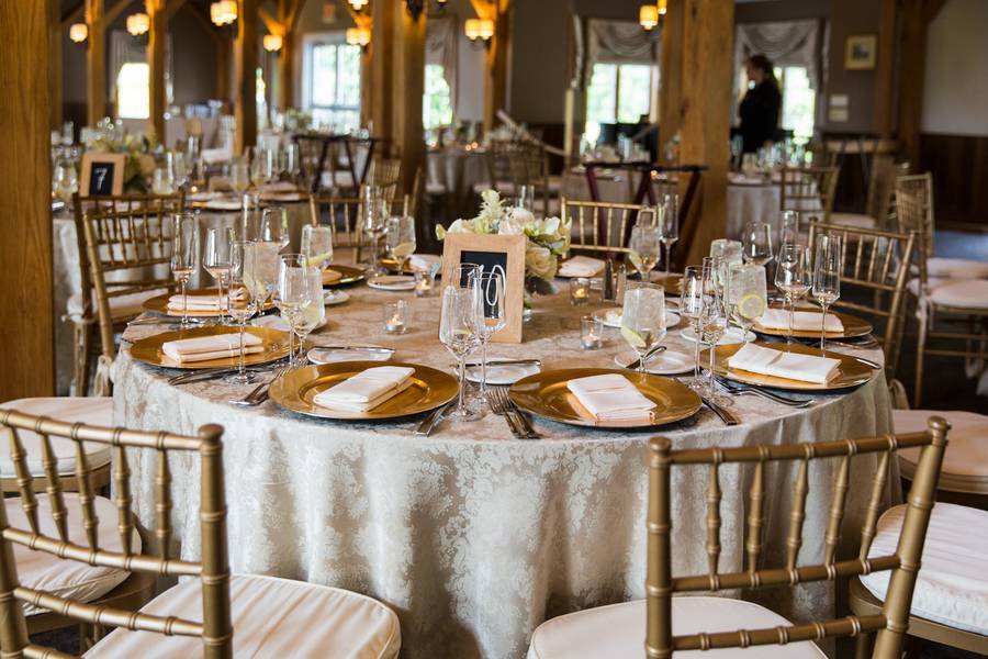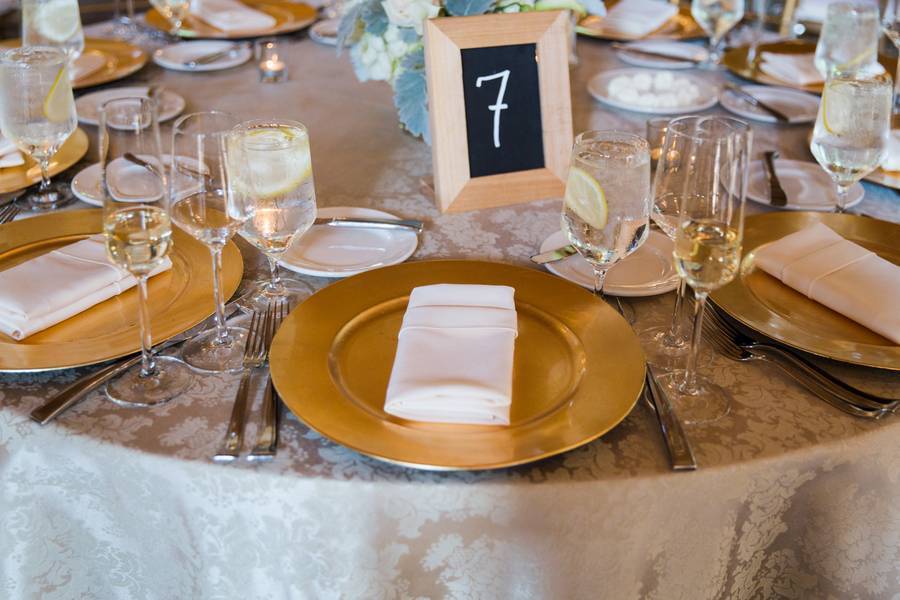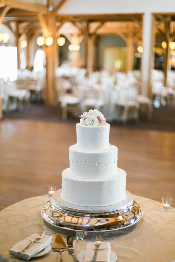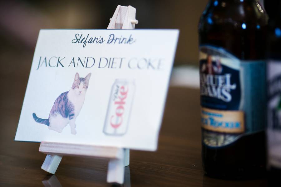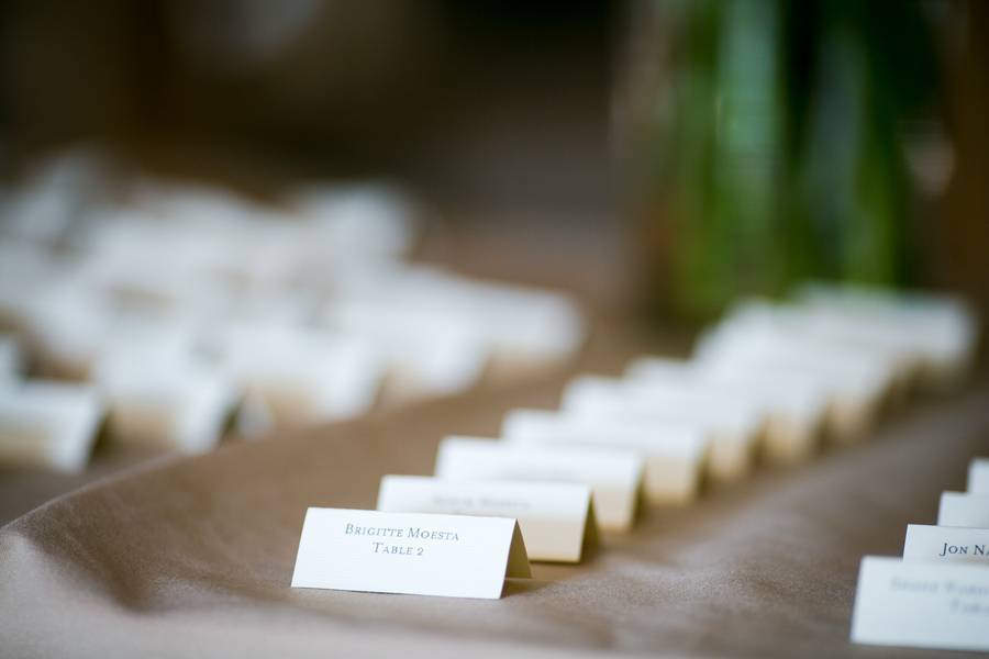 The Understated Decors: Cocktail hour took place in the tent outside of the venue with the reception following in the farm’s main building. Like their attire, the reception decor was elegant and understated, featuring gold chargers and classic white floral centerpieces. Sprinkled throughout the reception were many personal touches including a donut tree for Leslie’s mother’s birthday and the groom’s signature cocktail names after Leslie’s beloved cat, Jack.