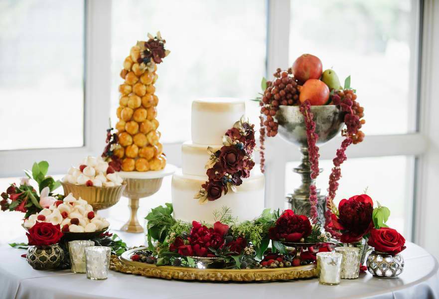 The cake that had a gold paint brushed look around it and deep oxblood flowers on top.
