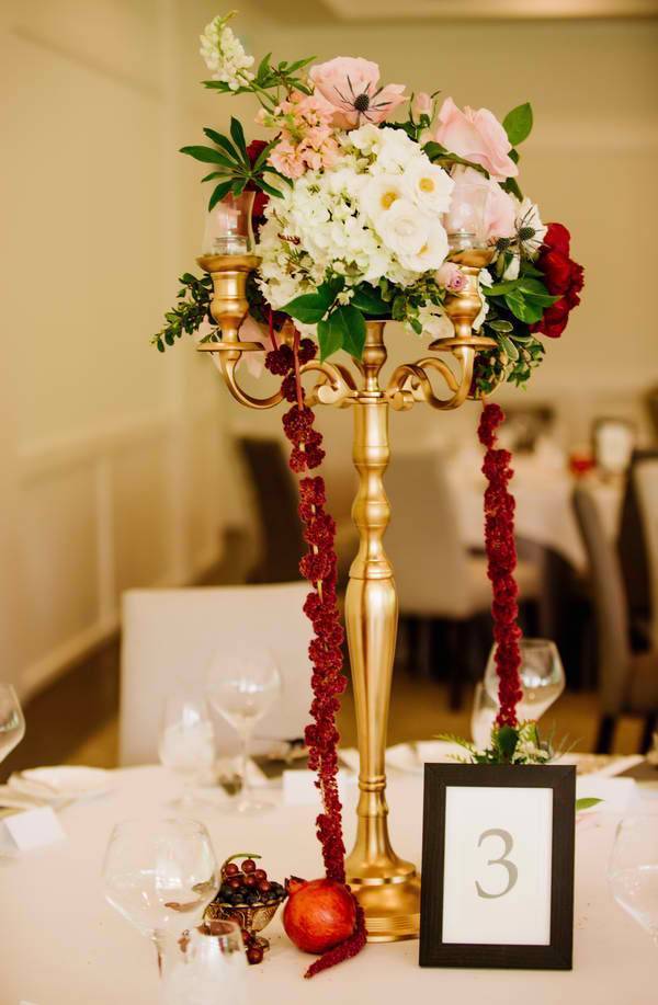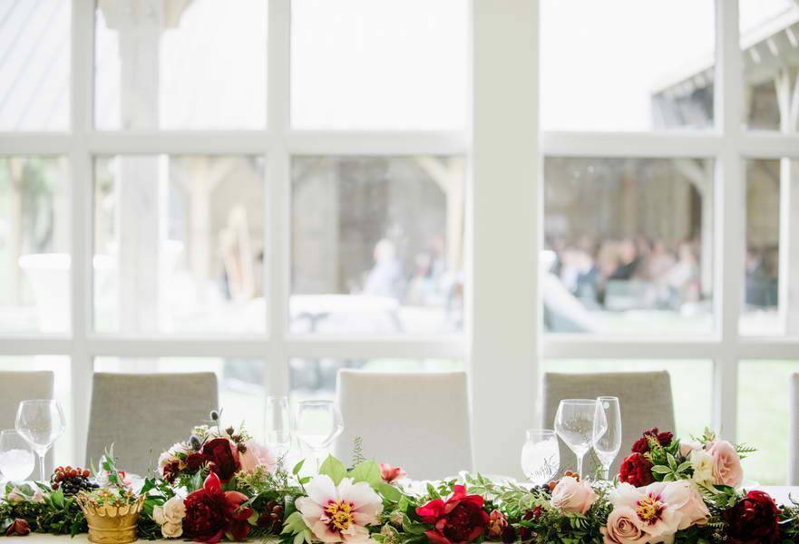 The floral arrangements were full of wild flowers, dark red roses, and helped create a more renaissance look.