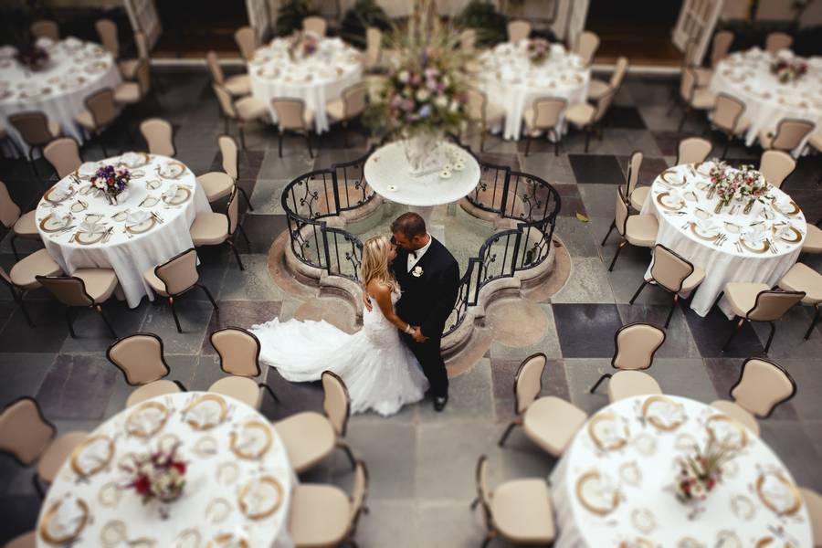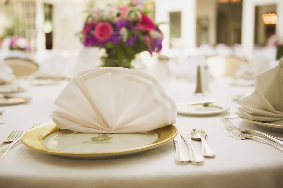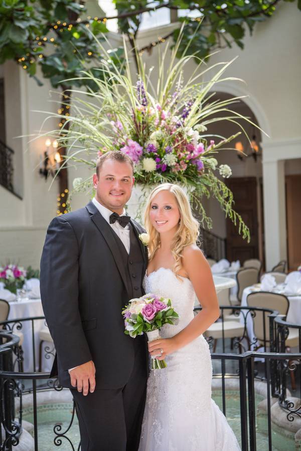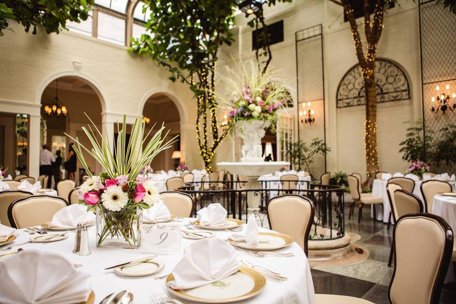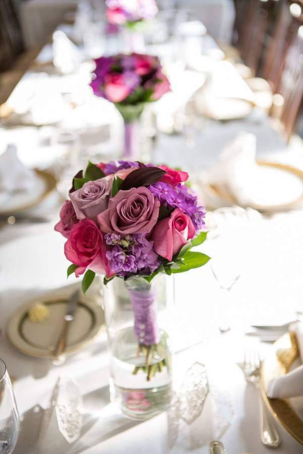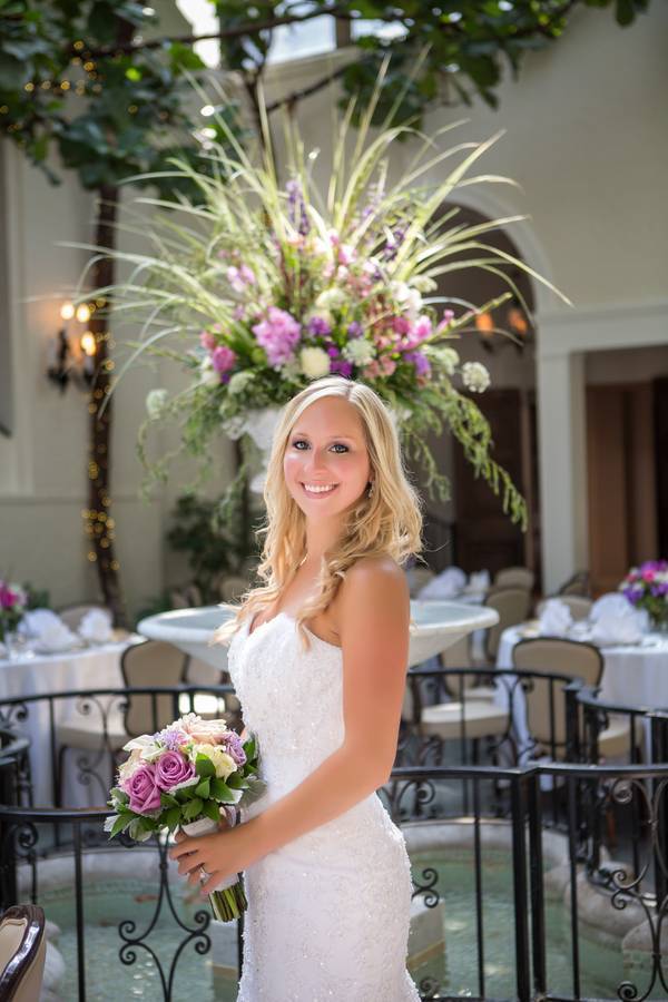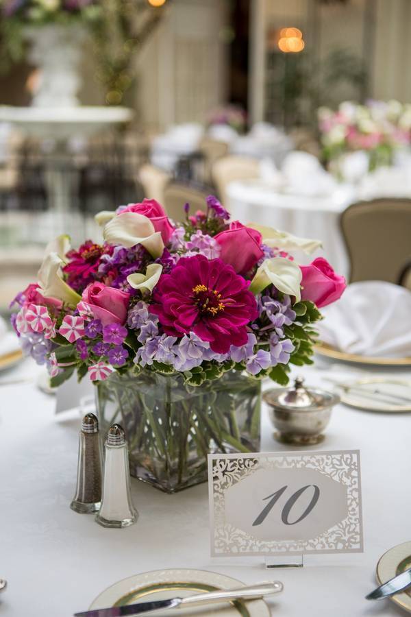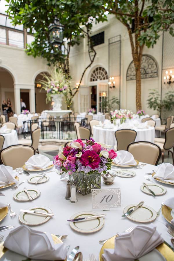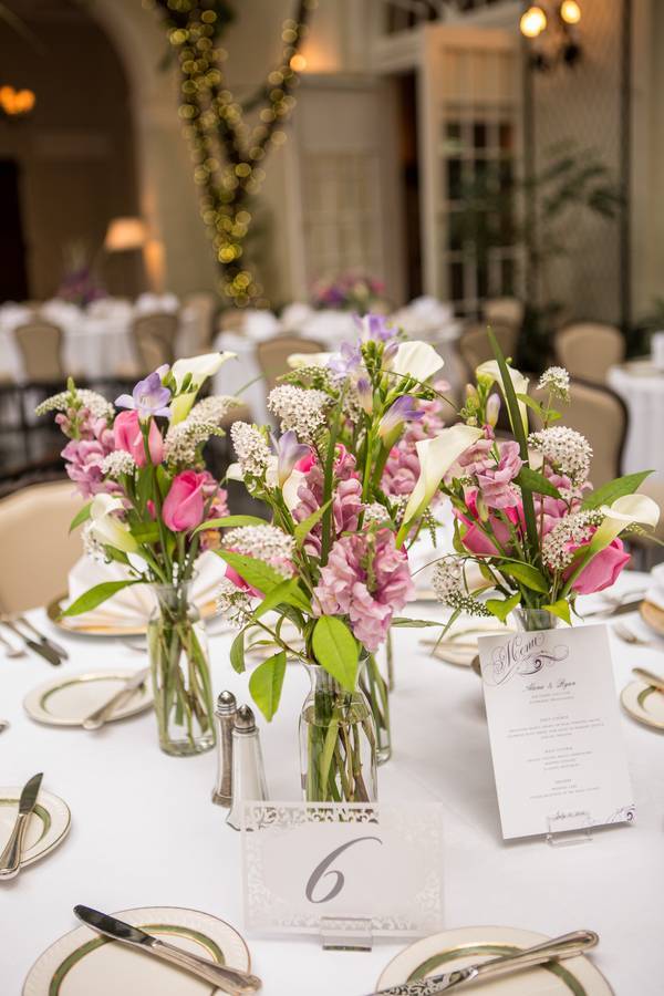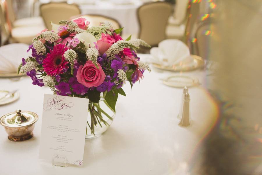 The decor. The wedding decor was inspired by the venue. The venue has a gorgeous atrium with lush gardens. Alana wanted a colorful, romantic feel with the decor and flowers. She kept the tables simple but elegant with white linens and table clothes, a menu cars, lace table number, and the floral center pieces which were different on each table.