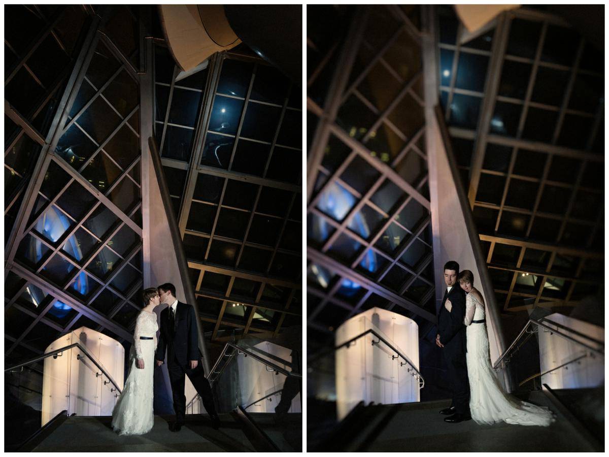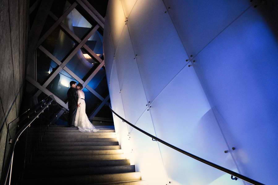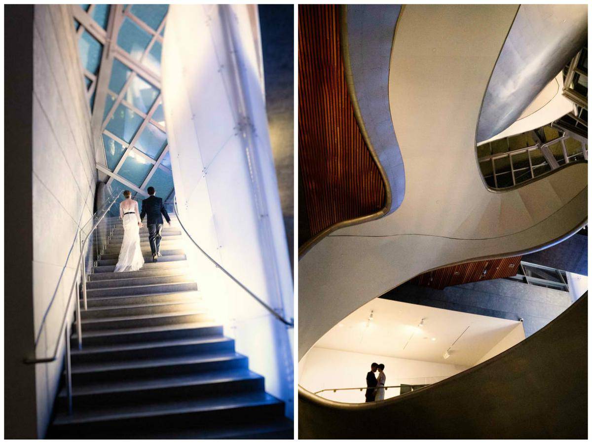 Jason and Emily had a very nontraditional wedding at the Art Gallery of Alberta. They had a wedding party with finger food. Guests were encouraged to go to the Art Gallery to view the exhibition. Emily is a huge cake fan and she ordered a very unique and beautiful wedding cake for her wedding. Jason and Emily are super down to earth and so easy to work with. I couldn’t say enough good things about them. Let us feel their moments of love readers as we take a peek to all these photographs by Daphne Chen Photography!