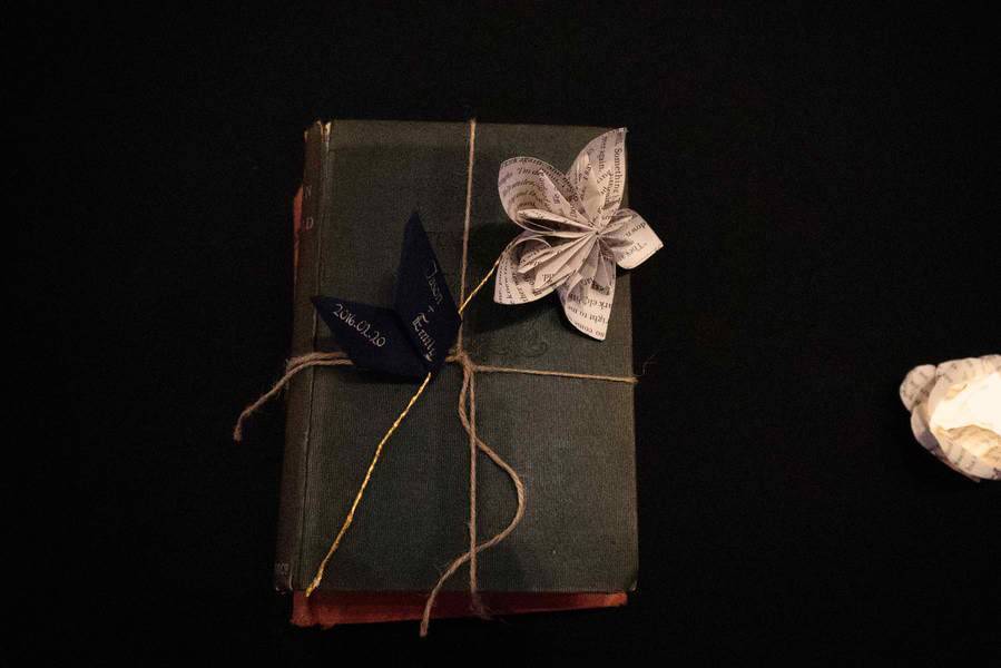 The flowers were hand folded from pages of their favorite books such as Harry Potter.