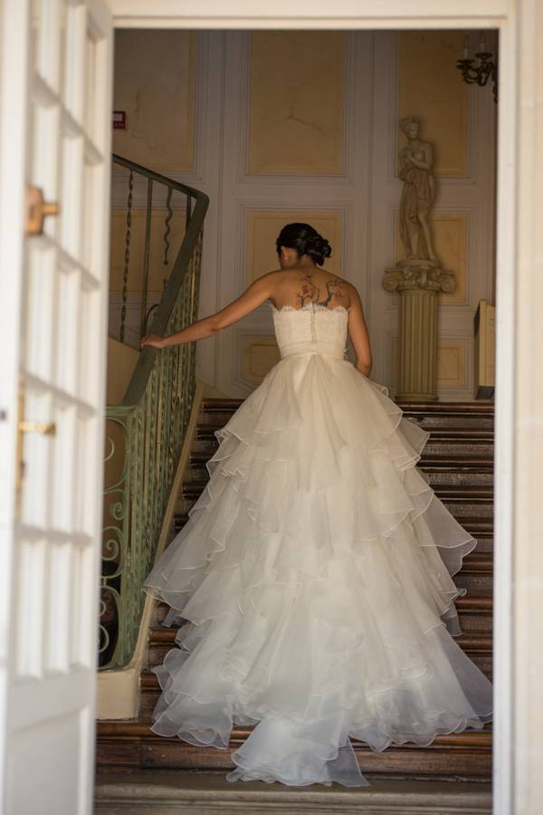 I chose a Rosa Clara wedding dress based on a picture I found on a French website. It was the first dress I tried on at the bridal shop in SF, and I knew it was the one instantly. I did not try on any other dress after that! The grooms bought their suits based on the color we provided to them. Our colors were gray and red. The bridesmaids and grooms wore gray.
