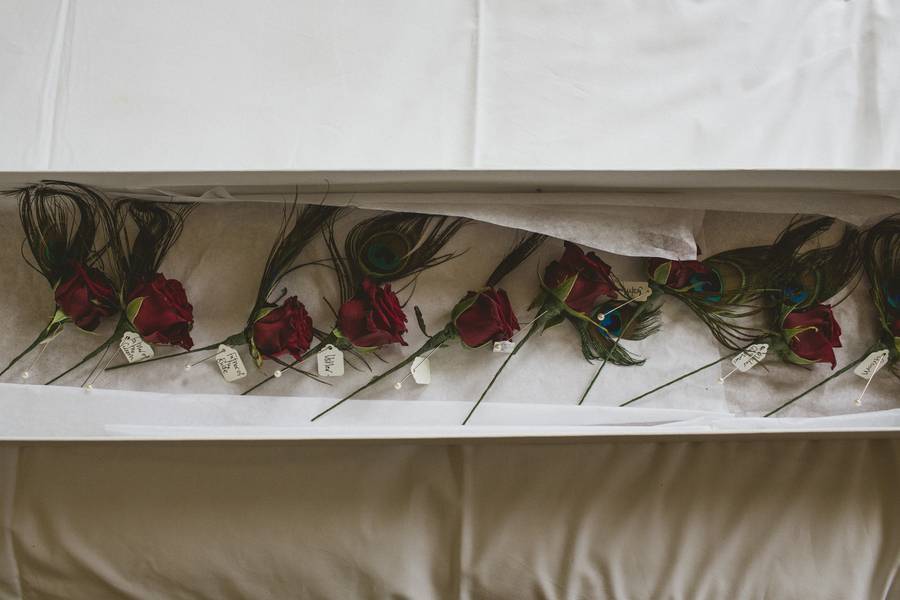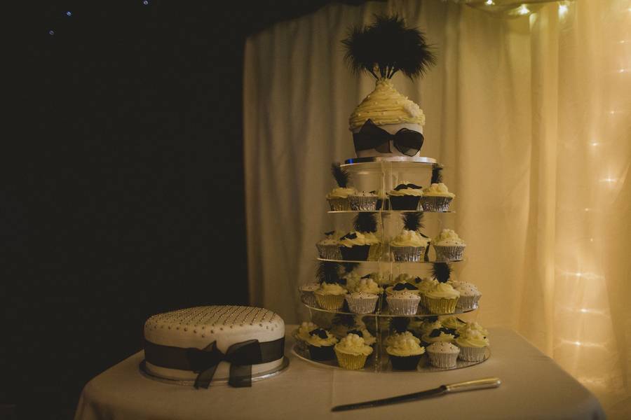 The theme. It was peacocks and glamour! All the boys had peacocks in their button holes and the table settings featured peacock feathers too! The cupcakes also had little mustaches on them to continue the vintage glamour theme!