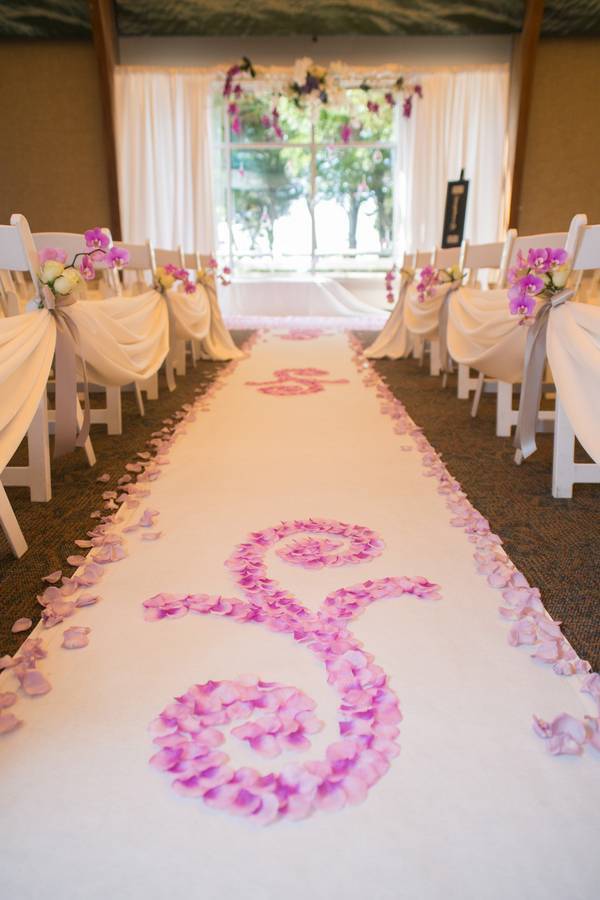 The florals and decor. Everywhere you looked, there were breathtaking florals with various shades of purples, pinks and white. The bride’s bouquet, the design of 8,000 rose petals on the aisle runner, the ceremony backdrop and the centerpieces at the reception helped turn this wedding into a picture perfect fairytale. The dragonfly pin on the maid of honor’s bouquet had a significance to the family. The florist glued all the petals to the runner down the aisle of the ceremony herself and created it just for this event.