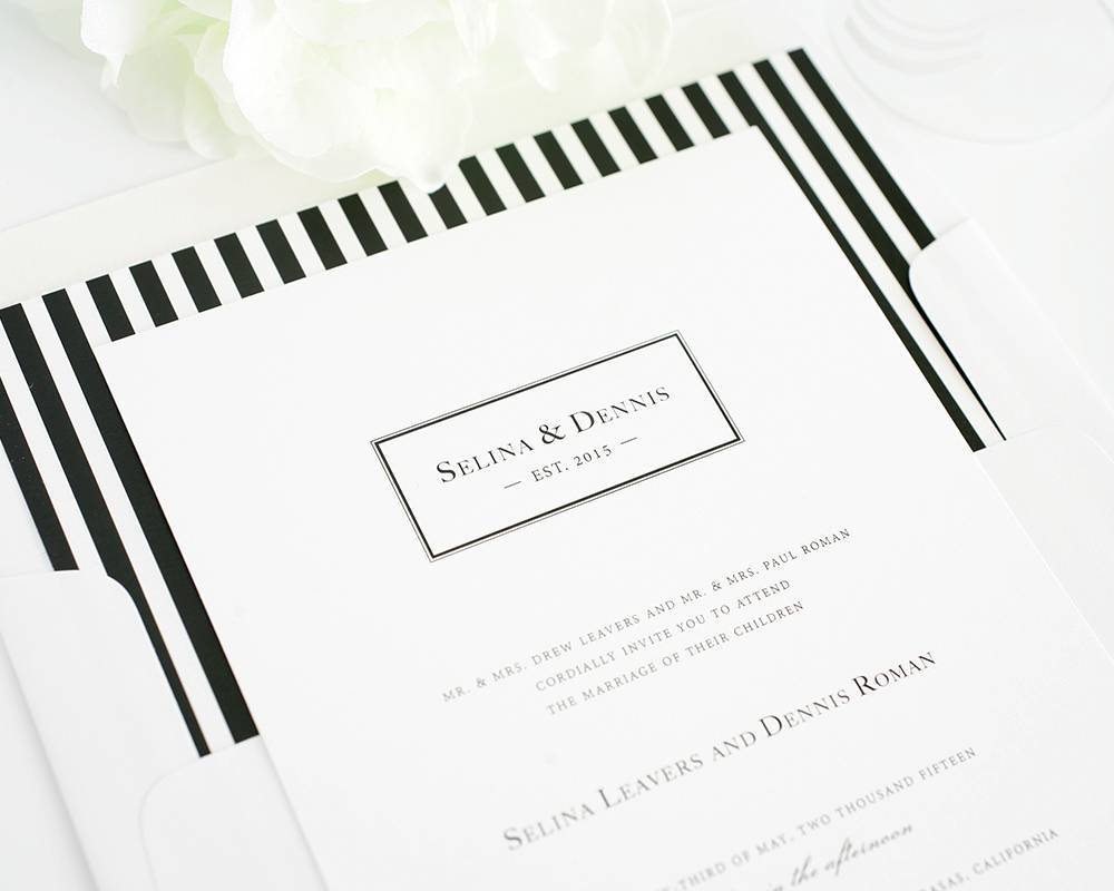 Another gorgeous example of black and white stripes, these invitations are very subtle and low-key, save for the bold and beautiful white stripe frame. The overall look is classic and elegant.