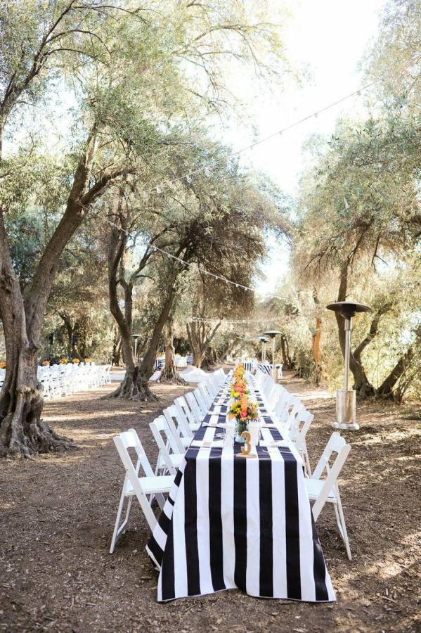 A striped tablecloth looks absolutely stunning against more neutral elements, like these white chairs. We love the dramatic look of this tablecloth.