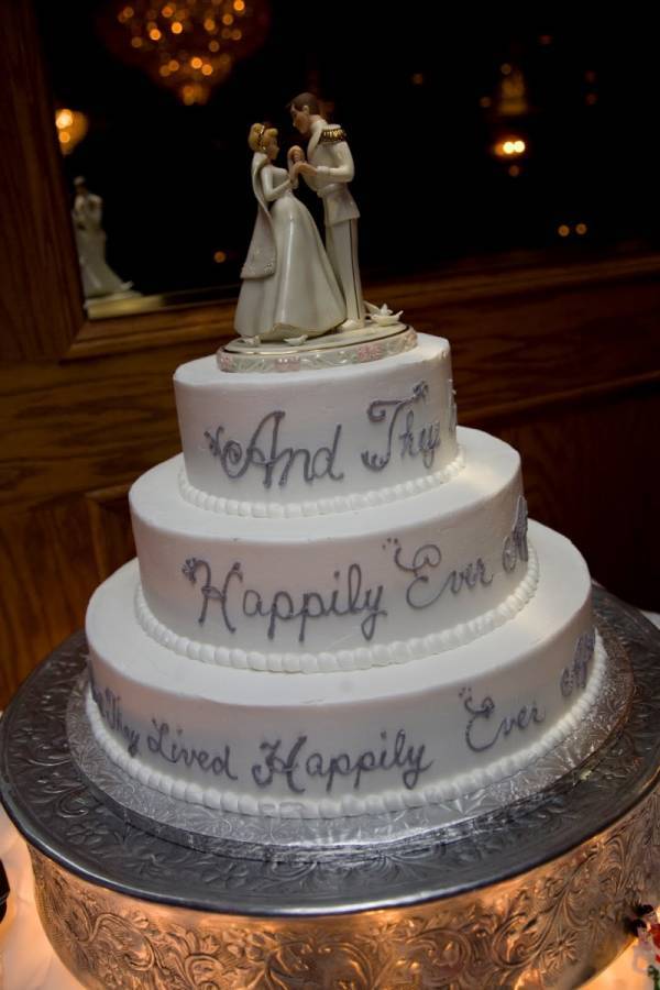 This adorable cake is just perfect for a fairytale wedding; it’s simple and elegant, but still has that fairytale vibe. The writing and picture on the cake are done in a shimmery silver, which is just beautiful.