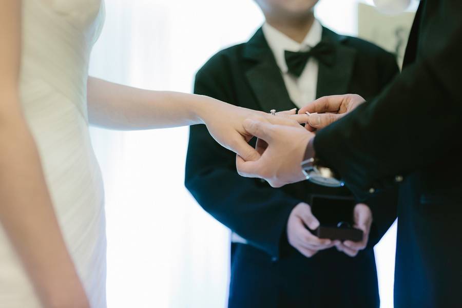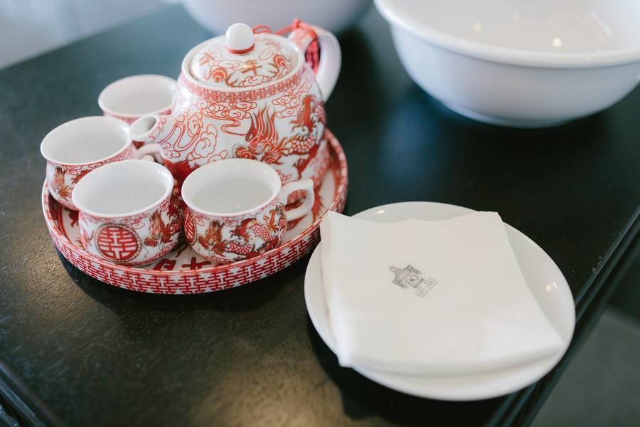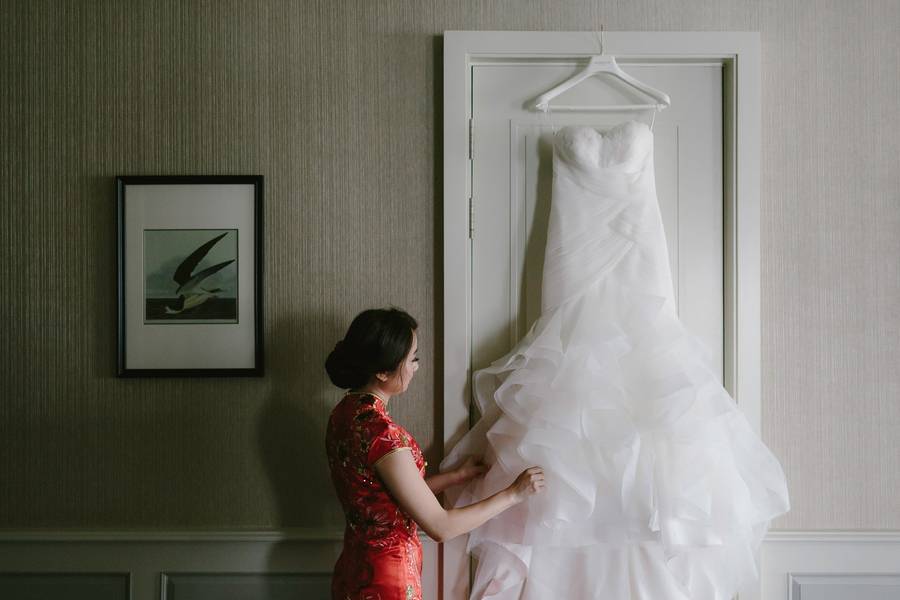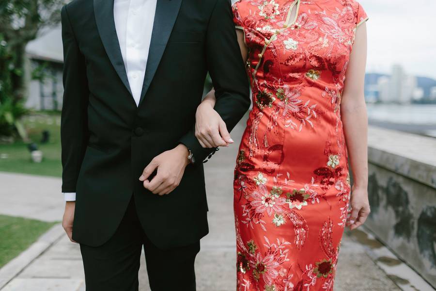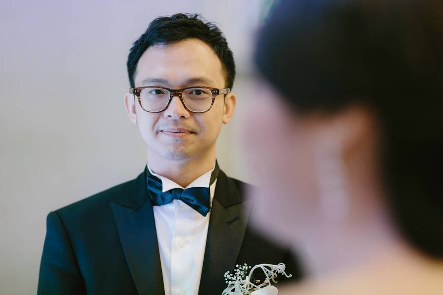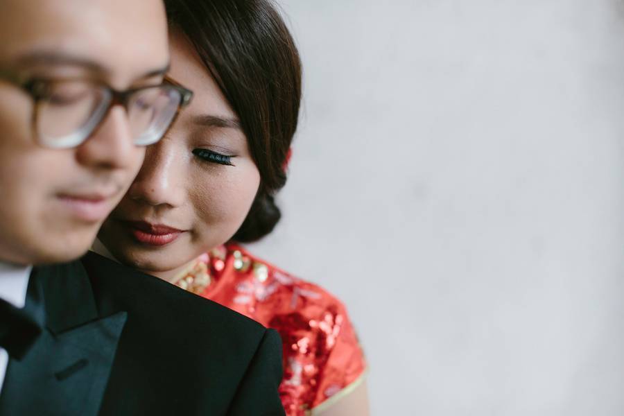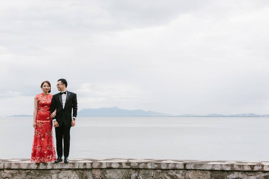I had on a red sequined ankle-length mermaid style Chinese wedding cheongsam for the tea ceremony. I wanted a cheongsam that would reflect our Chinese culture but at the same time not completely traditional. So the mermaid style of the dress was the modern element to the outfit while the rest of it still looks like how a traditional cheongsam would. For my wedding dress, I knew that I wanted a strapless dress, and the Pronovias Ledurne dress I had on made the strapless look more amazing with the feathered neckline. It was also a mermaid silhouette gown with tulle, which is a very flattering look. I kept the accessories minimal (with only a hair piece and ear rings) so it doesn’t take too much away from the dress. There were lots of compliments on the dress on my wedding day! As for the groom, he wanted to go for a classy look, so a tuxedo was the obvious choice for him and we had it custom made.