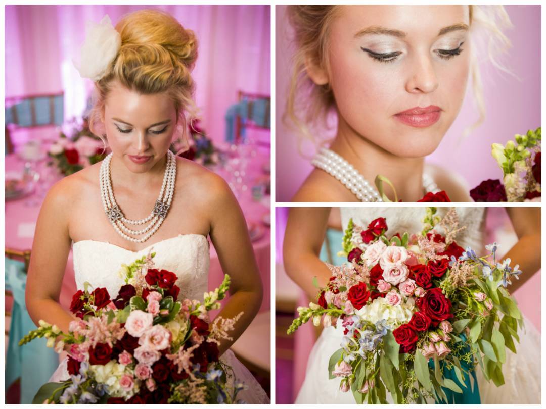 This inspiration shoot started with a “Love is Brewing” theme and a fun palette of pink, red, teal, and aqua shades. LB Floral designed floral arrangements around vintage milk glass details, including an adorable little flower teacup and bouquet overflowing with roses and greenery. Knox Wedding Creative and Rellek Video Productions captured the day.