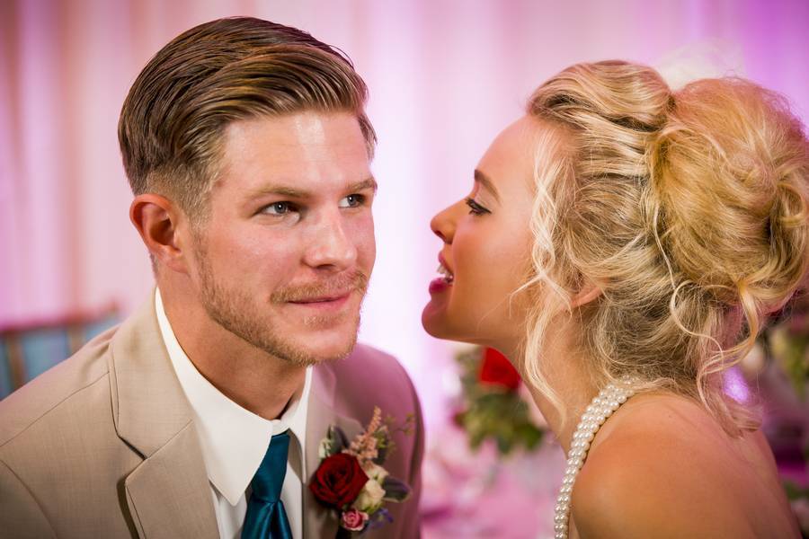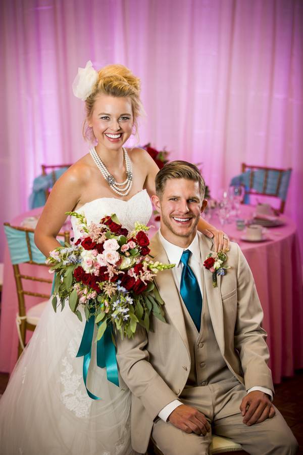 The would-be groom was dapper in a khaki tux with a teal tie from Savvi Formalwear and red rose boutonnière. The teal tie perfectly matched a ribbon detail on the bride’s bouquet. Southern Belle Beauty added with a loose luxe updo and a floral inspired hairpiece that perfectly complemented a gorgeous wedding gown from Wedding Wonderland. The dress made the bride look as if she was floating in tulle and ornate lace details. A coordinating necklace and bracelet set, each with three strands of pearls, was the perfect twist to a classic favorite. Everyone loves a costume change, and the short wedding dress with sweetheart neckline did not disappoint, especially when you throw in a pair of rose-inspired red heels.