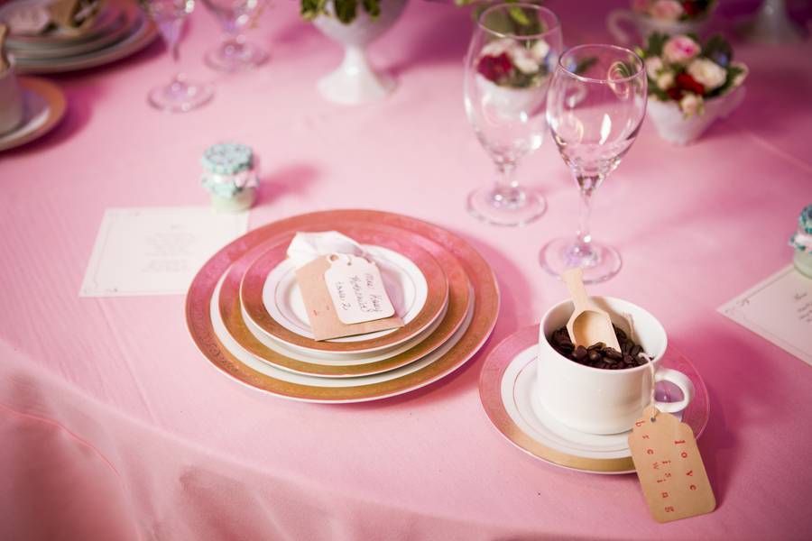 As a lover of coffee and tea, I am definitely a fan of this inspiration shoot. Needless to say, my favorite parts would be the tea bag favors as well as the coffee beans in the decor. This shoot also features an interesting color palette of light pink and teal with sky blue, rose red, and gold accents. This particular shade of pink is tricky because of how light it is – if not used properly, it can look borderline gaudy. Pairing it with the gold and teal provides contrast, but still maintains that soft, romantic vibe. As for the groom, he was dapper in a khaki suit with a teal tie, while the bride was beautifully swathed in layers of tulle and lace.