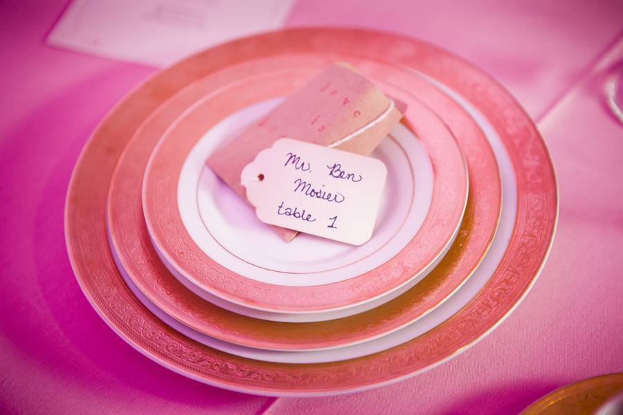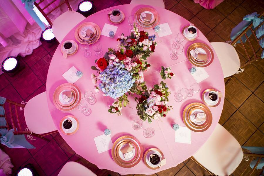 Rothchild Catering & Conference Center provided the perfect canvas to add sheer draping from floor to ceiling and pink tinted uplighting by Sequoyah Entertainment. Pink sugar flowers topped a 3-tiered wedding cake atop a modern cake stand from Sweet Beginnings by Elaine. The reception table was topped with pink linen with gold chargers and coordinated with gold chivari chairs, aqua sashes and gold-rimmed china from Event Rentals by Rothchild.