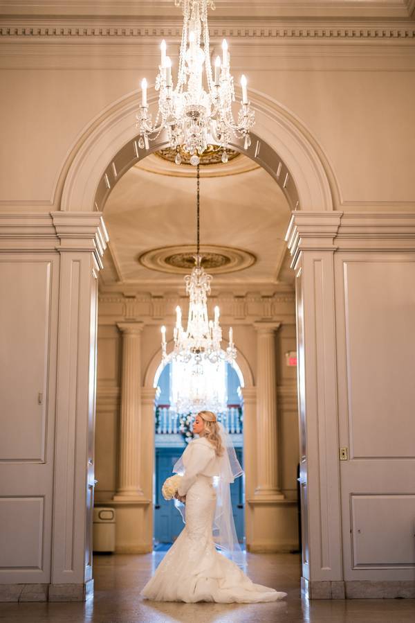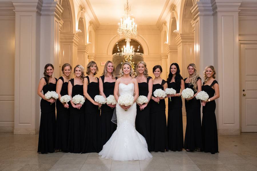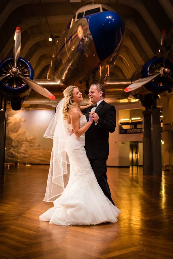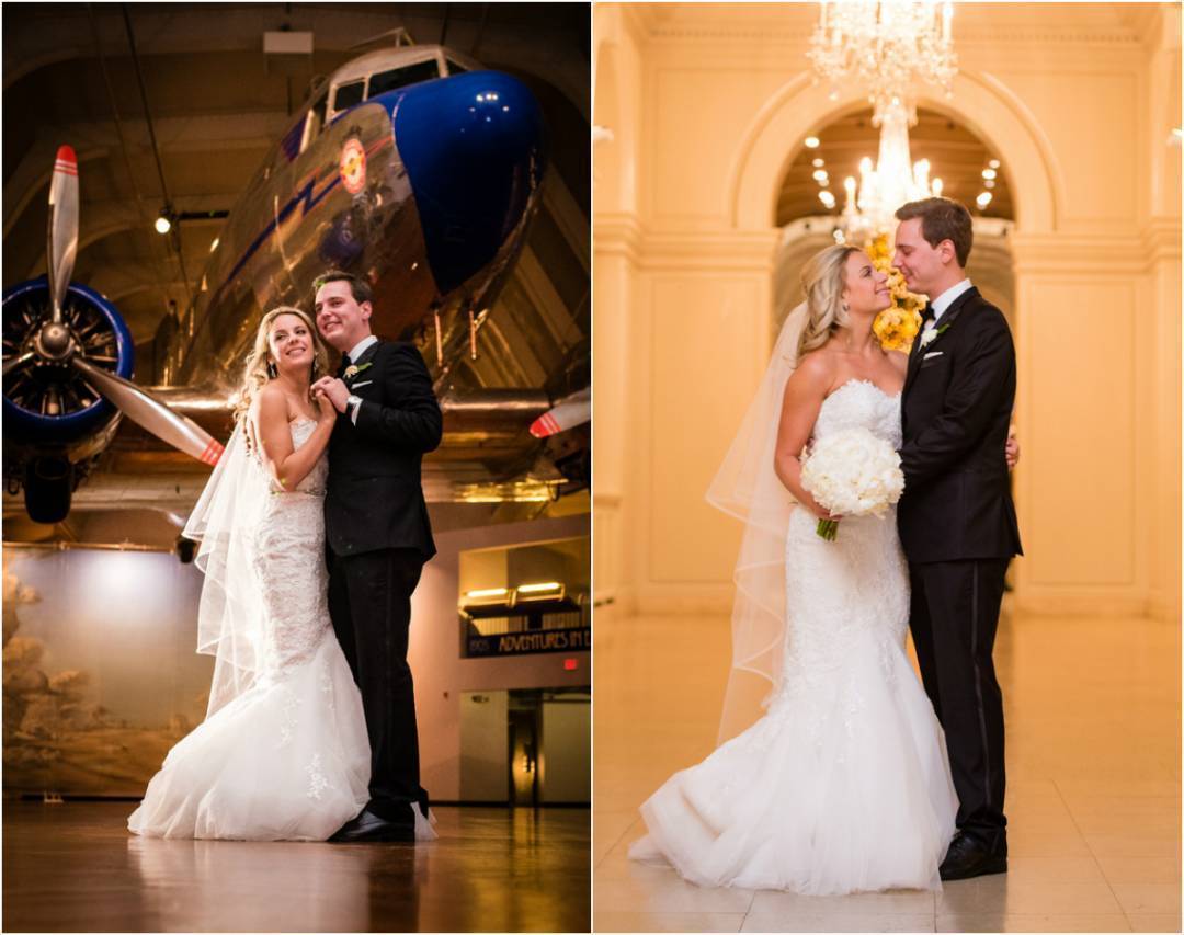 You couldn’t ask for a unique soiree – a New Year’s Eve wedding inside of the Henry Ford Museum. Guests in black tie attire, dancing under the Spirit of St Louis and mingling throughout a plethora of antique cars. A perfect evening topped off with a perfect kiss at midnight. The whole day was a classy and beautiful affair. The bride and her bridesmaids got ready at the established Townsend Hotel in Downtown Birmingham, arguably Metro Detroit’s finest hotel. The bridal party looked like they walked off of a runway; they were all gorgeous. Donning simple black dresses, the served as the perfect compliment to Melissa’s stunning white dress. Melissa and Matt were high school sweethearts, having been together for over ten years. Melissa, a salon owner, and stylist made sure that no detail was overlooked.
